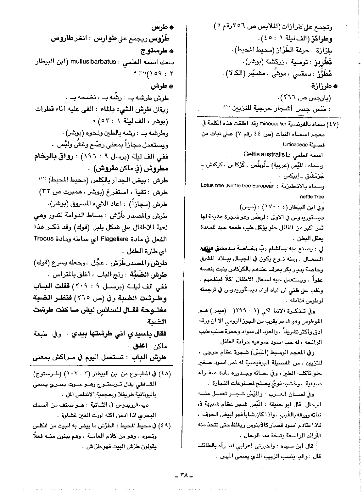 • طرس: طَرُوس ويجمع على طَوارِس: انظر طاروس• طرستوج: سمك اسمه العلمي: mullus barbatus ( ابن البيطار 2: 159)