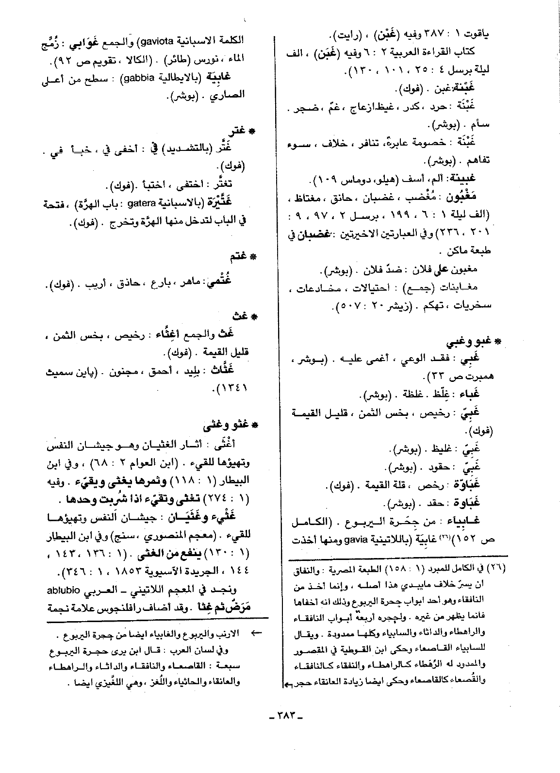 غابيِاء: من جِحَرة اليربوع. (الكامل ص152) غابِيةَ (باللاتينية gavia ومنها أخذت الكلمة الأسبانية gaviota) والجمع غَوَابي: زُمَّج الماء، نورس (طائر). (الكالا، تقويم ص92).