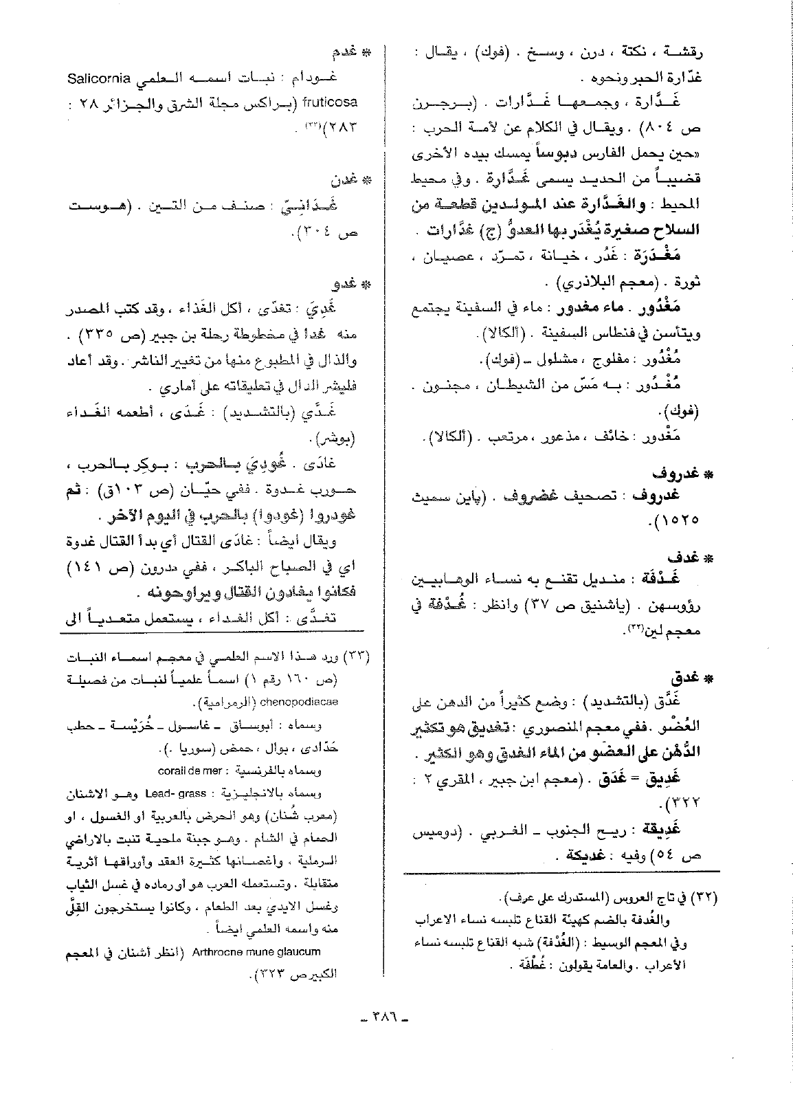 • غدم: غوادم: نبات اسمه العلمي Salicornia fruticosa ( براكس مجلة الشرق والجزائر 28: 283).