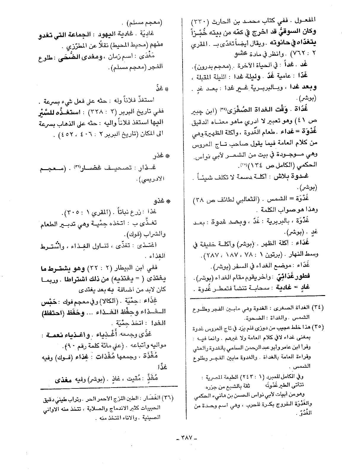 غَدَاة. وَقْت الغداة الصُغْرَى (ابن جبير ص41) وهو تعبير لا ادري ما هو معناه الدقيق غُدْوَة= غداء. طعام الغَدوة، وأكله الظهيرة وهي من كلام العامة فيما يقول صاحب تاج العروس وهي موجودة في بيت من الشعر لأبي نواس الحكمي (الكامل ص134).