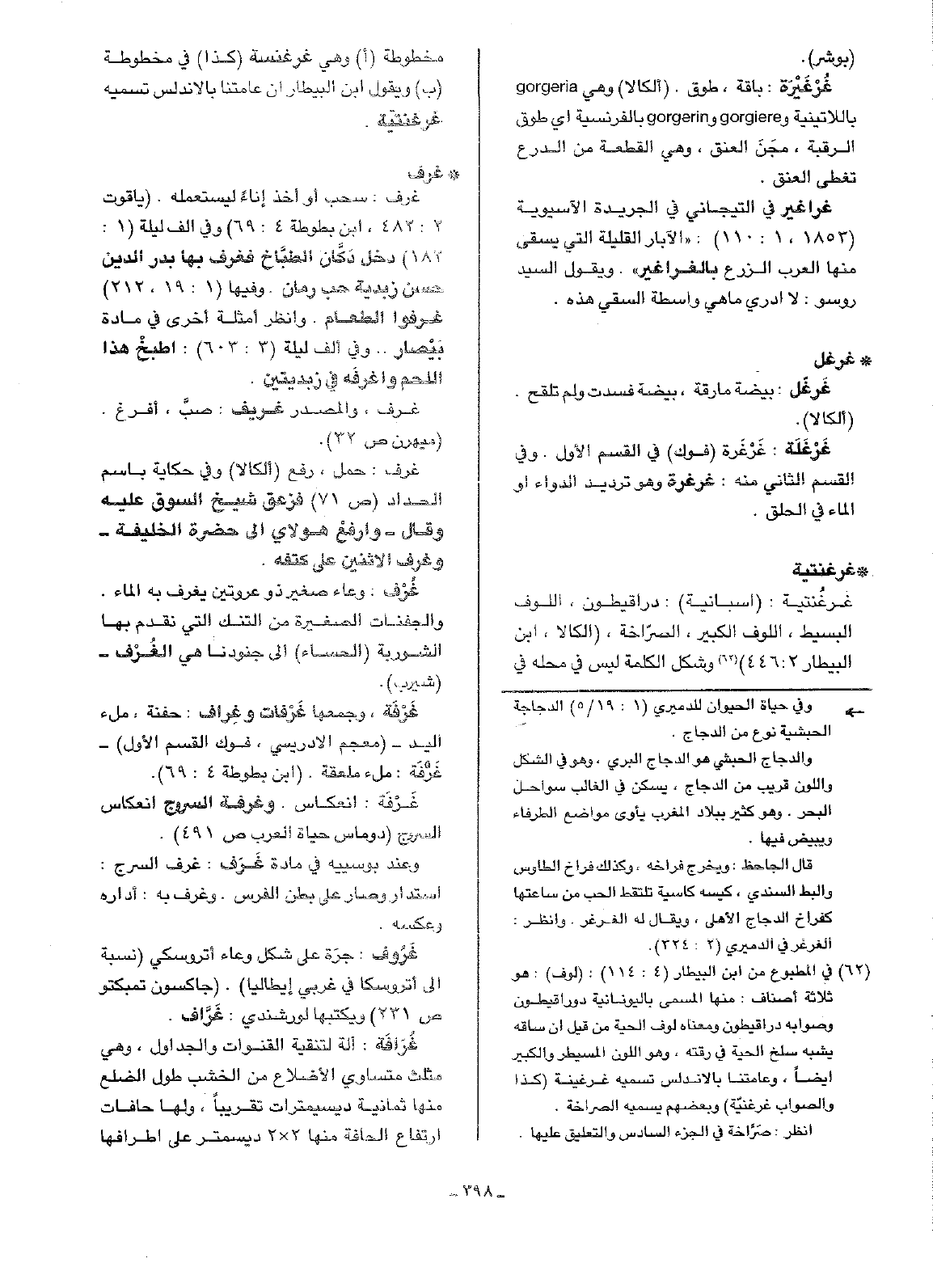 • غرف: غرف: سحب أو أخذ إناءً ليستعمله. (ياقوت 2: 482، ابن بطوطة 4: 69) وفي ألف ليلة (1: 182) دخل دَكَّان الطبَّاخ فعرف بها بدر الدين حسن زبدية حب الرمان. وفيها (1: 19، 212) غرفوا الطعام. وانظر أمثلة أخرى في مادة بَيْضار .. وفي ألف ليلة (3: 603): اطبخْ هذا اللحم واغرفَه في زبدتين.