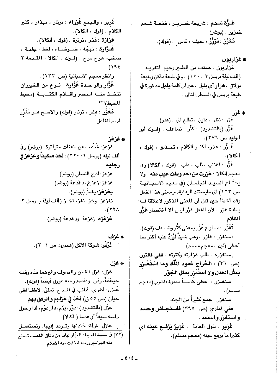 • غزاريون: غزاريون: صنف من الطير رخيم التغريد. (ألف ليلة برسل 3: 120). وفي طبعة ماكن وطبعة بولاق: هزار أي بابا، غير أن كلمة بلبل مذكورة في طبعة برسل في السطر التالي.