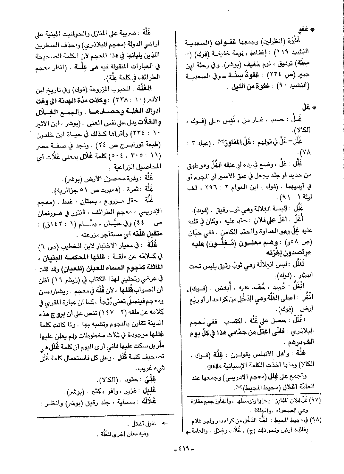 غُلّة: في معيار الاختبار لابن الخطيب (ص6) في كلامَه عن ملقة: غللها المحكمة البنيان، الماثلة كنجوم السماء للعبان (للعيان) وقد قلت في عرضي وتحليلي لهذا الكتاب في (زيشر 16) أظن أن الصواب قُللها، لأن قُلَّة في معجم ريشاردسن ومعجم فينسلي تعني بُرْجاً، كما أن عبارة المقري في كلامه عن ملقه (2: 147) تنص على أن بروج هذه المدينة تقارن بالنجوم وتشبه بها. ولما كانت كلمة غللها موجودة في ثلاث مخطوطات ولم يعلن عليها ملَّر بل سكت عليها فاني أرى اليوم أن كلمة غُلَل هي تصحيف كلمة قُلَل. وعلى كل فاستعمال كلمة غُلَل شيء غريب.