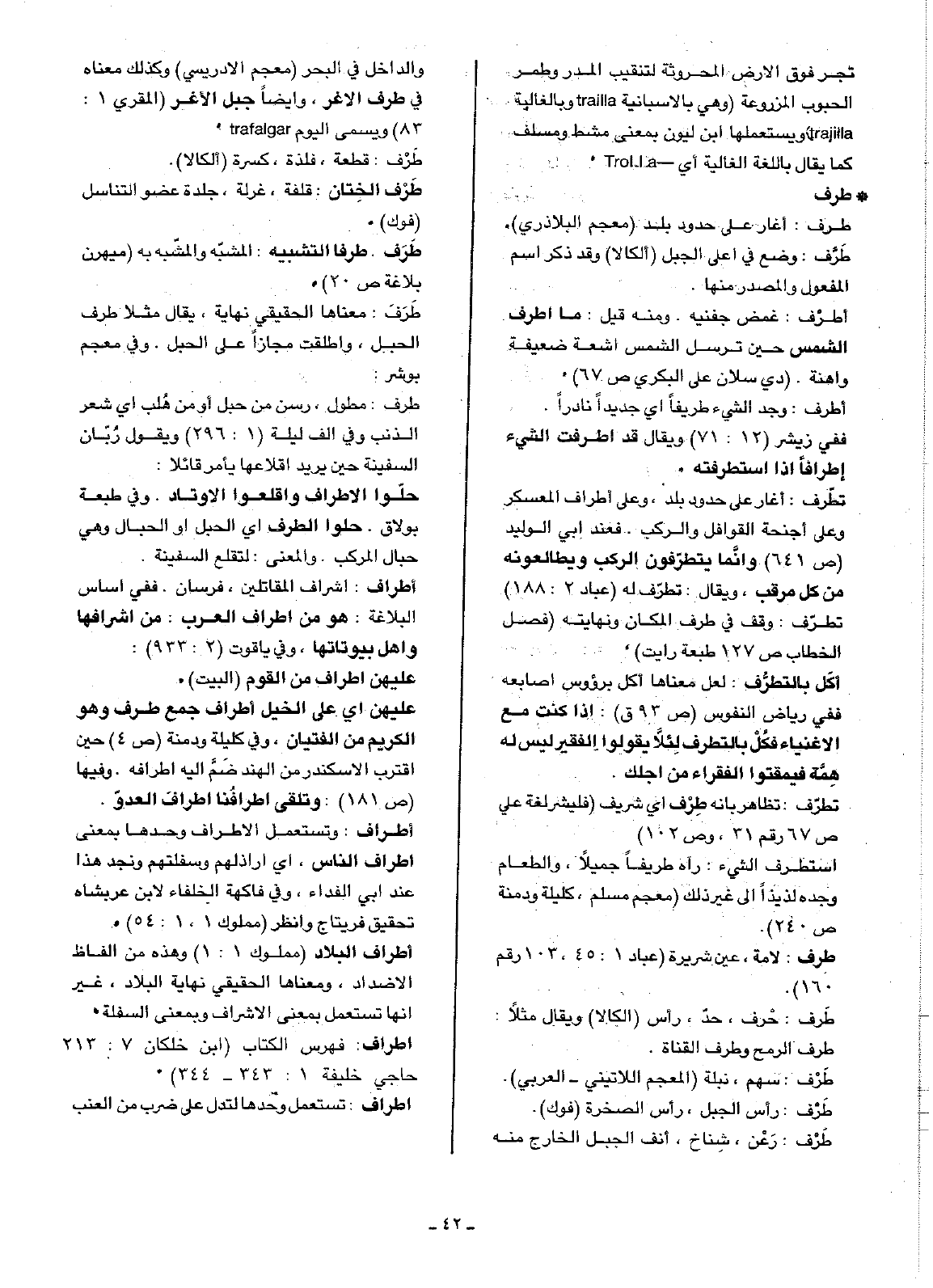 أطراف: وتستعمل الأطراف وحدها بمعنى أطراف الناس، أي أراذلهم وسفلتهم ونجد هذا عند أبي الفداء، وفي فاكهة الخلفاء لابن عربشاه تحقيق فريتاج وانظر (مملوك 1، 1: 54).