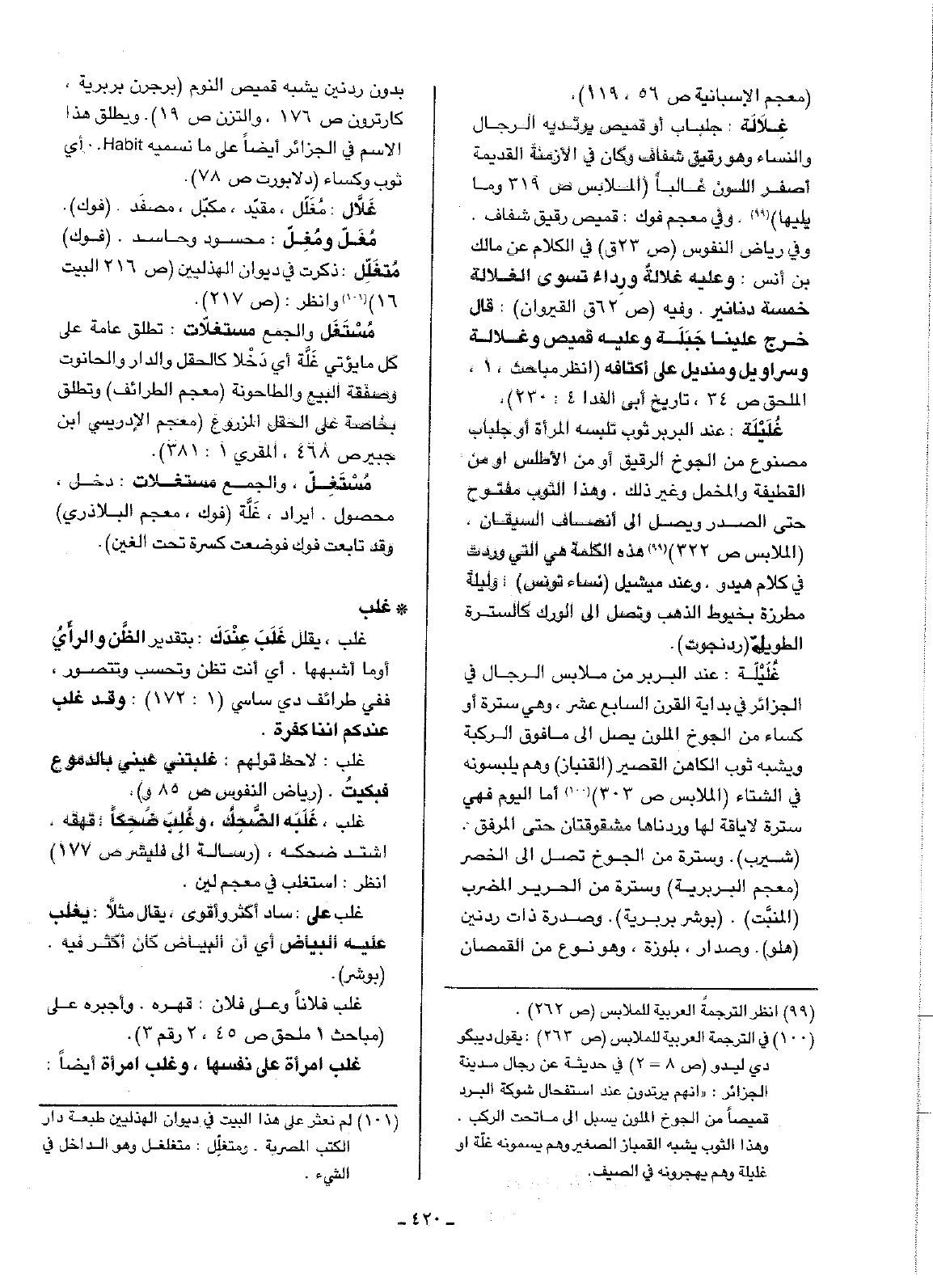 غِلاَلَة: جلباب أو قميص يرتديه الرجال والنساء وهو رقيق شفاف وكان في الأزمنة القديمة أصفر اللون غالباً (الملابس ص319 وما يليها). وفي معجم فوك: قميص رقيق شفاف. وفي رياض النفوس (ص33 ق) في الكلام عن مالك بن أنس: وعليه غلالةٌ ورداءُ تسوى الغلالة خمسة دنانير. وفيه (ص62 ق القيروان): قال خرج علينا جَبَلَة وعليه قميص وغلالة وسراويل ومنديل على أكتافه (انظر مباحث، 1، الملحق ص34، تاريخ أبي الفدر 4: 230).