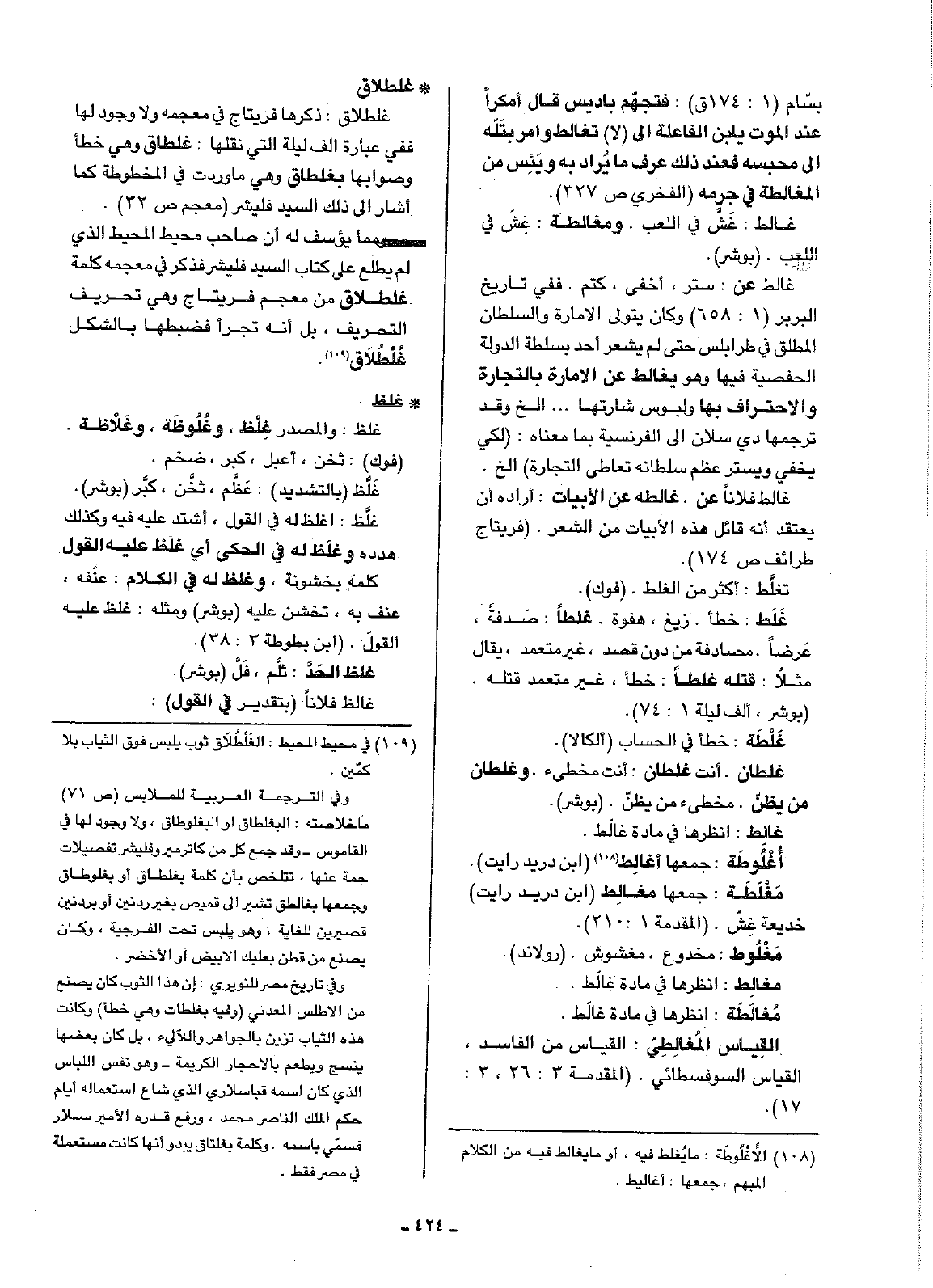 • غلطلاق: غلطلاق: ذكرها فريتاج في معجمه ولا وجود لها ففي عبارة ألف ليلة التي نقلها: غلطاق وهي خطأ وصوابها بغلطاق وهي ما وردت في المخطوطة كما أشار إلى ذلك السيد فليشر (معجم ص32).