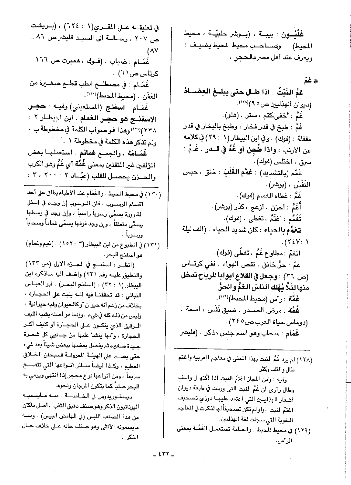 غَمَام: إسفنج (المستعيني) وفيه: حجر الإسفنج هو حجر الغمام. ابن البيطار 2: 238) وهذا هو صواب الكلمة في مخطوطة ب، ولم تذكر هذه الكلمة في مخطوطة أ.