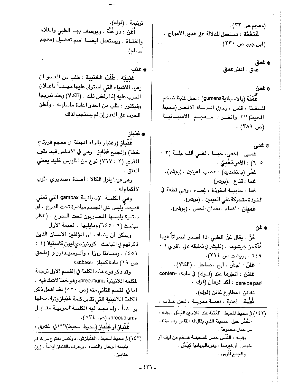 ويمكن أن يضاف إلى المؤلفين الأسبان الذين ذكرتهم في المباحث: كورتيز دي ليون كاستيلا (1: 451)، وسانتا روزا، وألسيداريو (ملحق ص19) مادة كمباز canbases وقد ذكر فوك هذه الكلمة في القسم الأول ترجمة للكلمة اللاتينية ( preputium) وهو خطأ لا شك فيه. أما في القسم الثاني منه (ص520) فقد أهمل ذكر الكلمة اللاتينية التي تقابل كلمة غنباز وترك محلها بياضاً. ولم نجد فيه الكلمة العربية مقابل ( preputium) ( ص534).