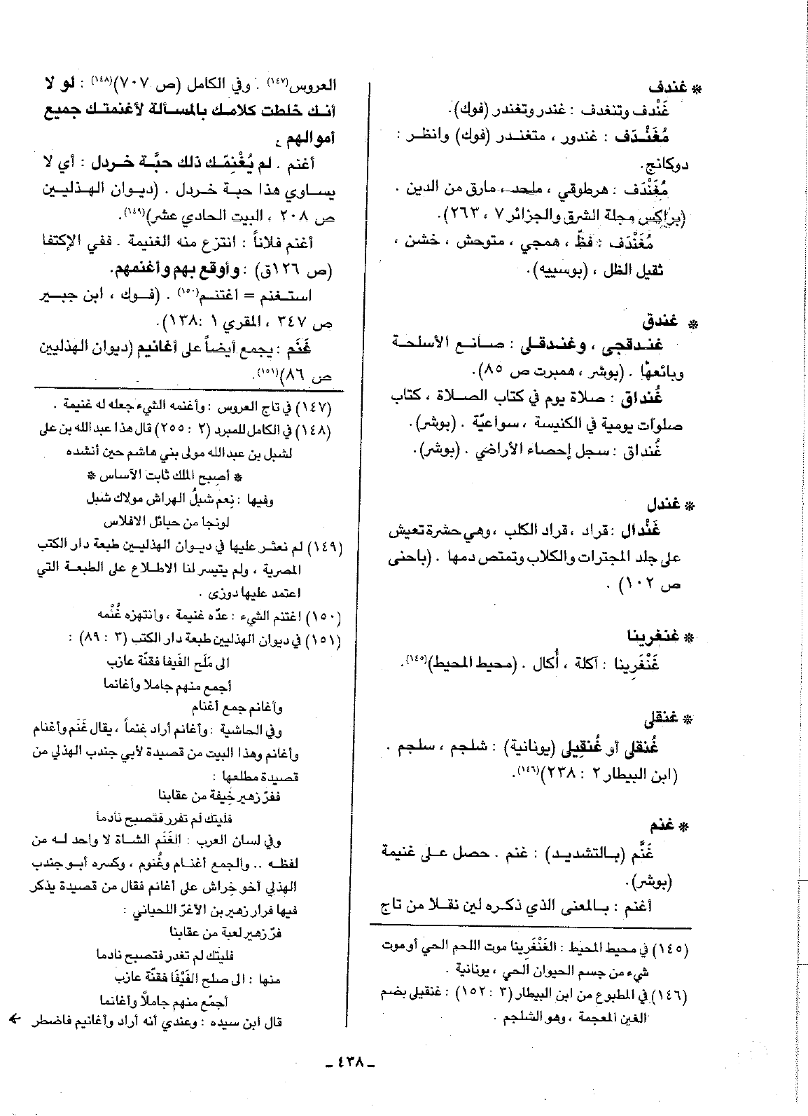 غَنَم: يجمع أيضاً على أغانيم (ديوان الهذليين ص86).