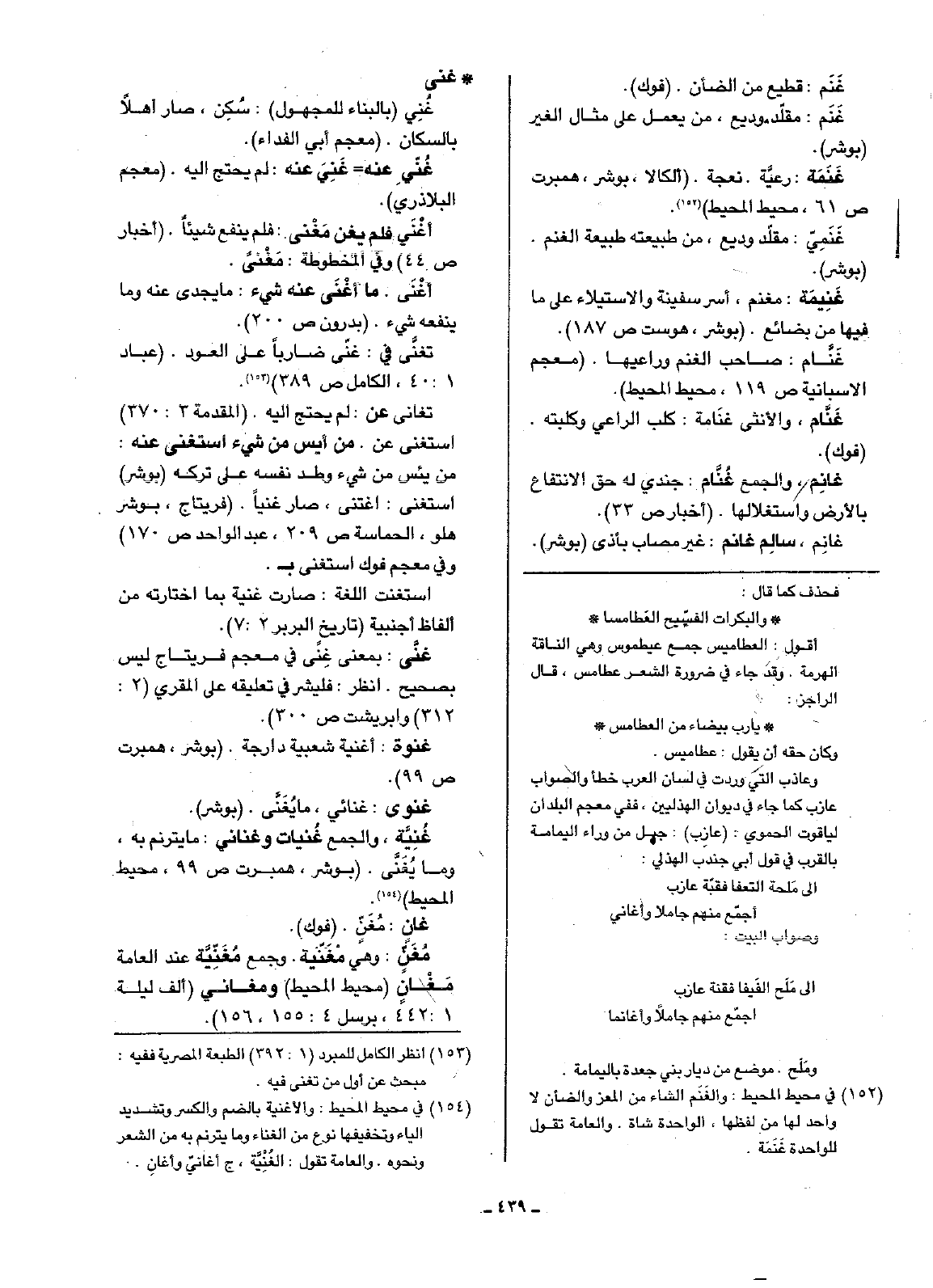 غنَّى: بمعنى غِنّى في معجم فريتاج ليس بصحيح. انظر: فليشر في تعليقه على المقري (2: 312) وابريشت ص300).