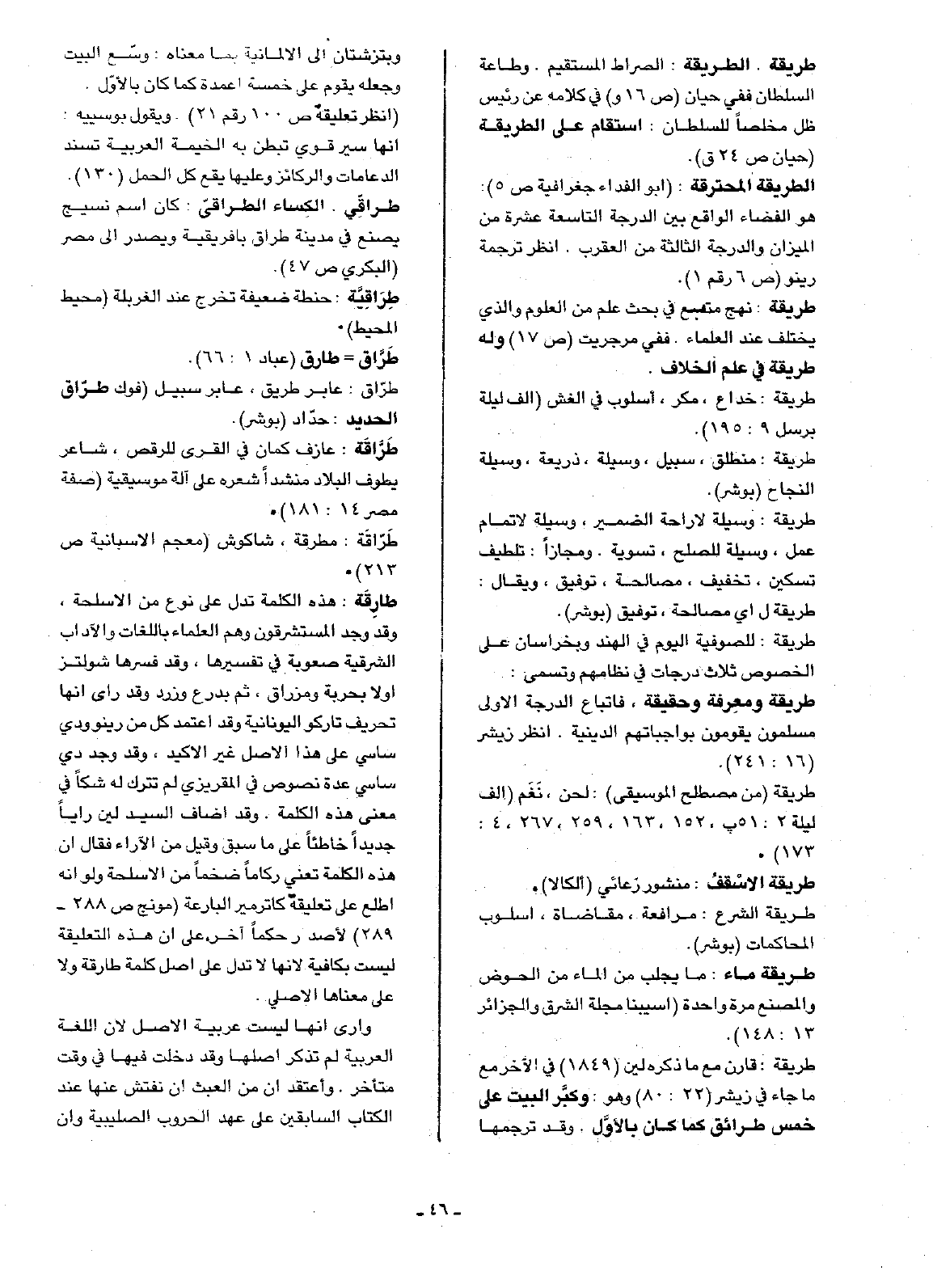 طريقة: للصوفية اليوم في الهند وبخراسان على الخصوص ثلاث درجات في نظامهم وتسمى: طريقة ومعرفة وحقيقة، فاتباع الدرجة الأولى مسلمون يقومون بواجباتهم الدينية. أنظر زيشر (16: 241) طريقة (من مصطلح الموسيقى): لحن، نغم (ألف ليلة 2: 51 ب، 152، 163، 259، 267، 4: 173).