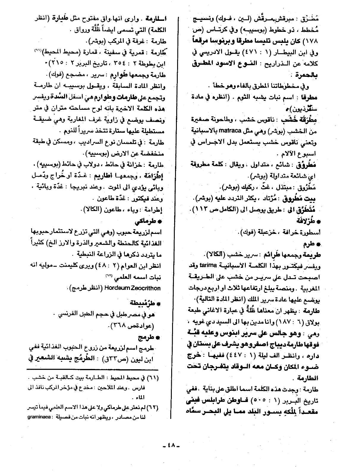 ويفسر فكتور بهذا الكلمة الأسبانية tarima وقد أصبحت تدل على سرير من خشب على الطريقة المغربية. ومنصة يبلغ ارتفاعها ثلاث أو أربع درجات يوضع عليها عادة سرير الملك (انظر المادة التالية) طارمة: يظهر أن معناها ظُلةَّ في عبارة الاغاني طبعة بولاق (6: 187) وانا مدين بها إلى السيد دي غويه، وهي: وهو جالس على سرير أبنوس وعليه قبَّة فوقها طارمة ديباج اصفر وهو يشرف على بستان في داره، وانظر ألف ليلة (1: 447) ففيها: خرج ضوء المكان وكان معه الوقاد يتفرجان تحت الطاروة.
