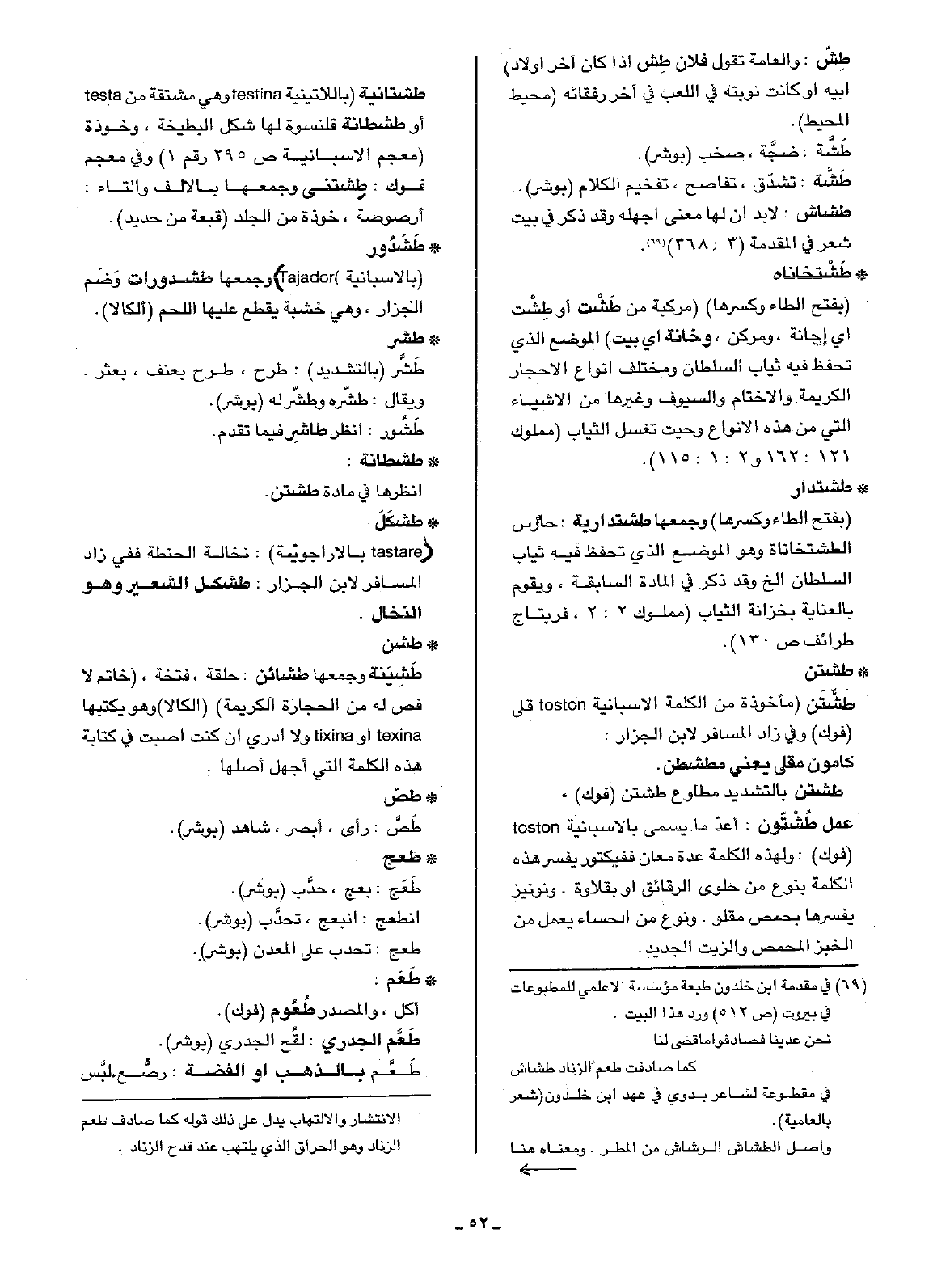• طشن: طَشِيَنة وجمعها طشائن: حلقة، فتخة، (خلتم لا فص له من الحجارة الكريمة) (الكالا) وهو يكتبها texine أو tixina ولا أدري أن كنت أصبت في كتابة هذه الكلمة التي أجهل أصلها.