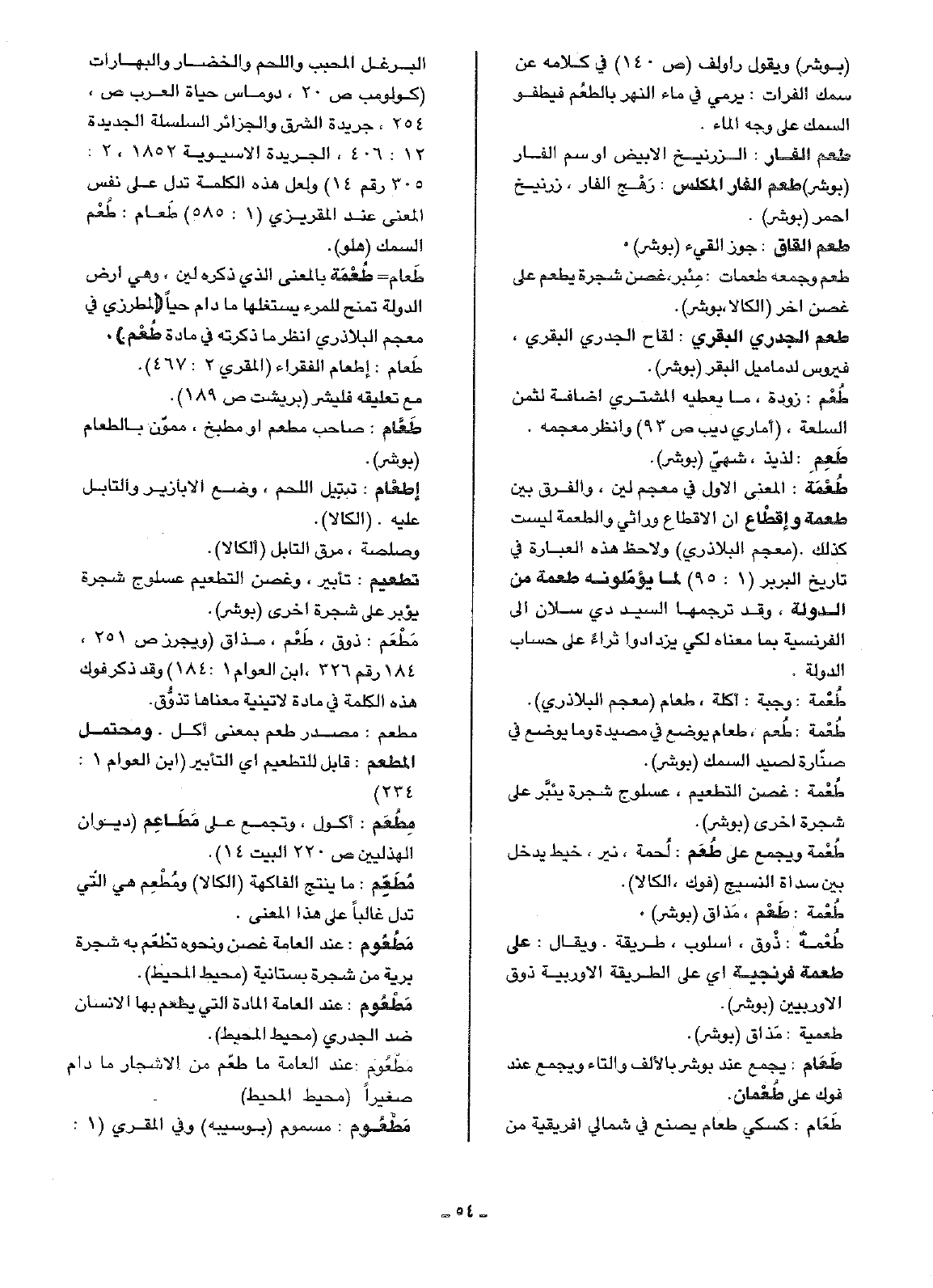 طَعَام: كسكي طعام يصنع في شمالي افريقية من البرغل المحبب واللحم والخضار والبهارات (كولومب ص20، دوماس حياة العرب ص254، جريدة الشرق والجزائر السلسلة الجديدة 12: 406، الجريدة الآسيوية 1852، 2: 305 رقم 14) ولعل هذه الكلمة تدل على نفس المعنى عند المقريزي (1: 585) طعام: طُعْم السمك (هلو).