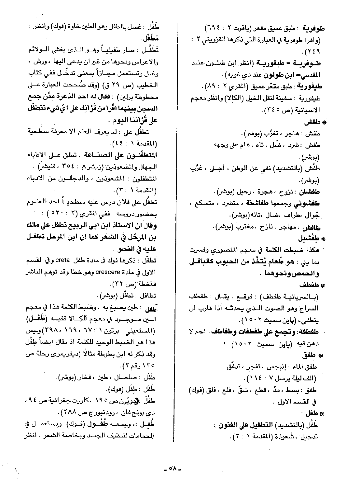 • طفل: طَفَّل (بالتشديد) التطفيل على الفنون: تدجيل، شعوذة (المقدمة 1: 3) طَفَّل: غسل بالطفل وهو الطين خاوة (فوك) وانظر: مَطَفّل.