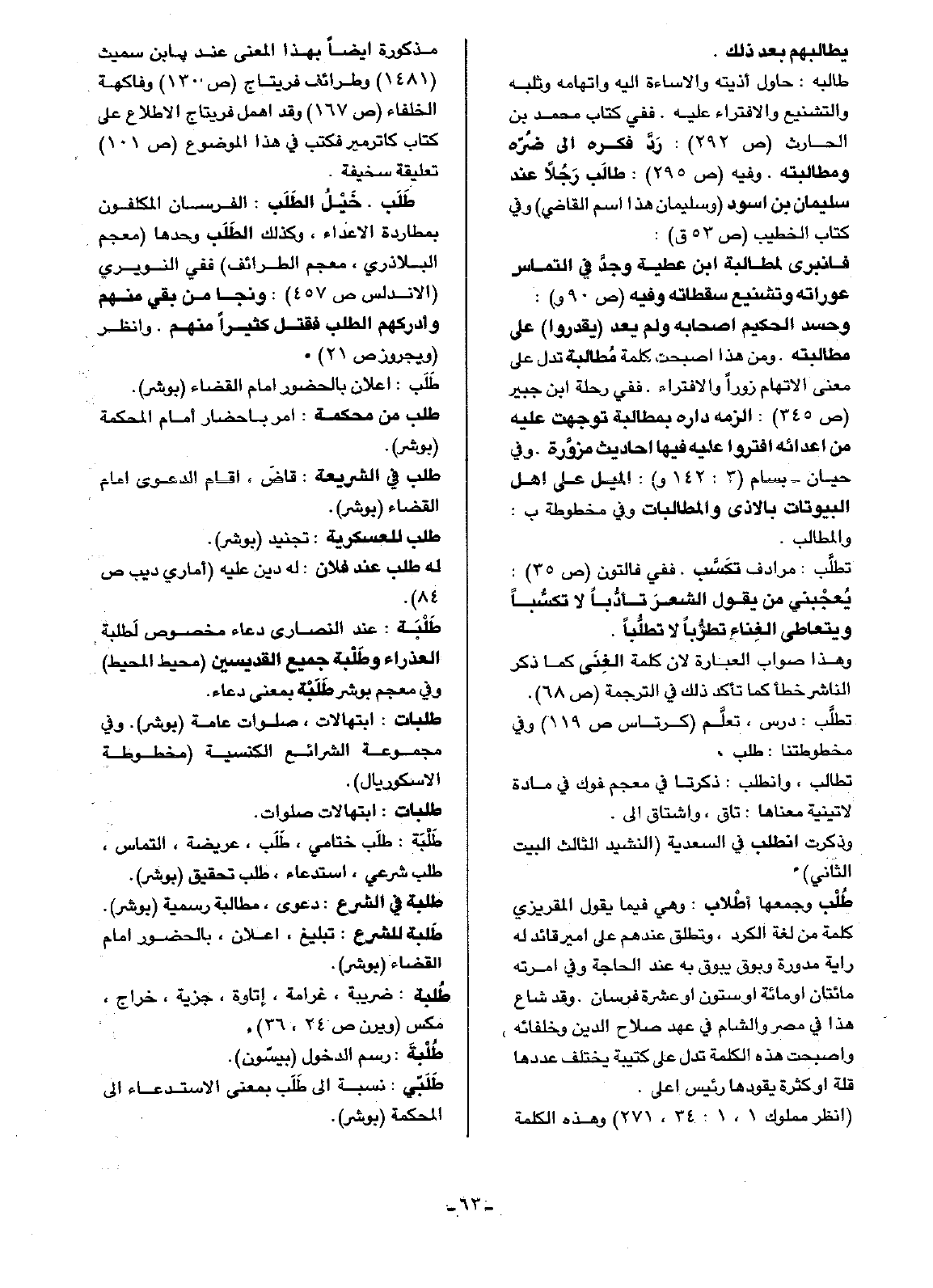 يطالبهم بعد ذلك طالبه: حاول أذيته والإساءة إليه واتهامه وثلبه والتشنيع والافتراء عليه. ففي كتاب محمد بن الحارث (ص292): رَدَّ فكره إلى ضُرّه ومطالبته. وفيه (ص295): طالب رَجُلاً عند سليمان بن أسود (وسليمان هذا اسم القاضي) وفي كتاب الخطيب (ص53 ق): فانبرى لمطالبة ابن عطية وجدَّ في التماس عوراته وتشنيع سقطاته وفيه (ص90 و): وحسد الحكيم أصحابه ولم يعد (يقدروا) على مطالبته. ومن هذا أصبحت كلمة مُطالبة تدل على معنى الاتهام زوراً والافتراء. ففي رحلة ابن جبير (ص345): الزمه داره بمطالبة توجهت عليه من أعدائه افتروا عليه فيها أحاديث مزوَّرة. وفي حيان- بسام (3 - 142و): الميل على أهل البيوتات بالأذى والمطالبات وفي مخطوطة ب: والمطالب.