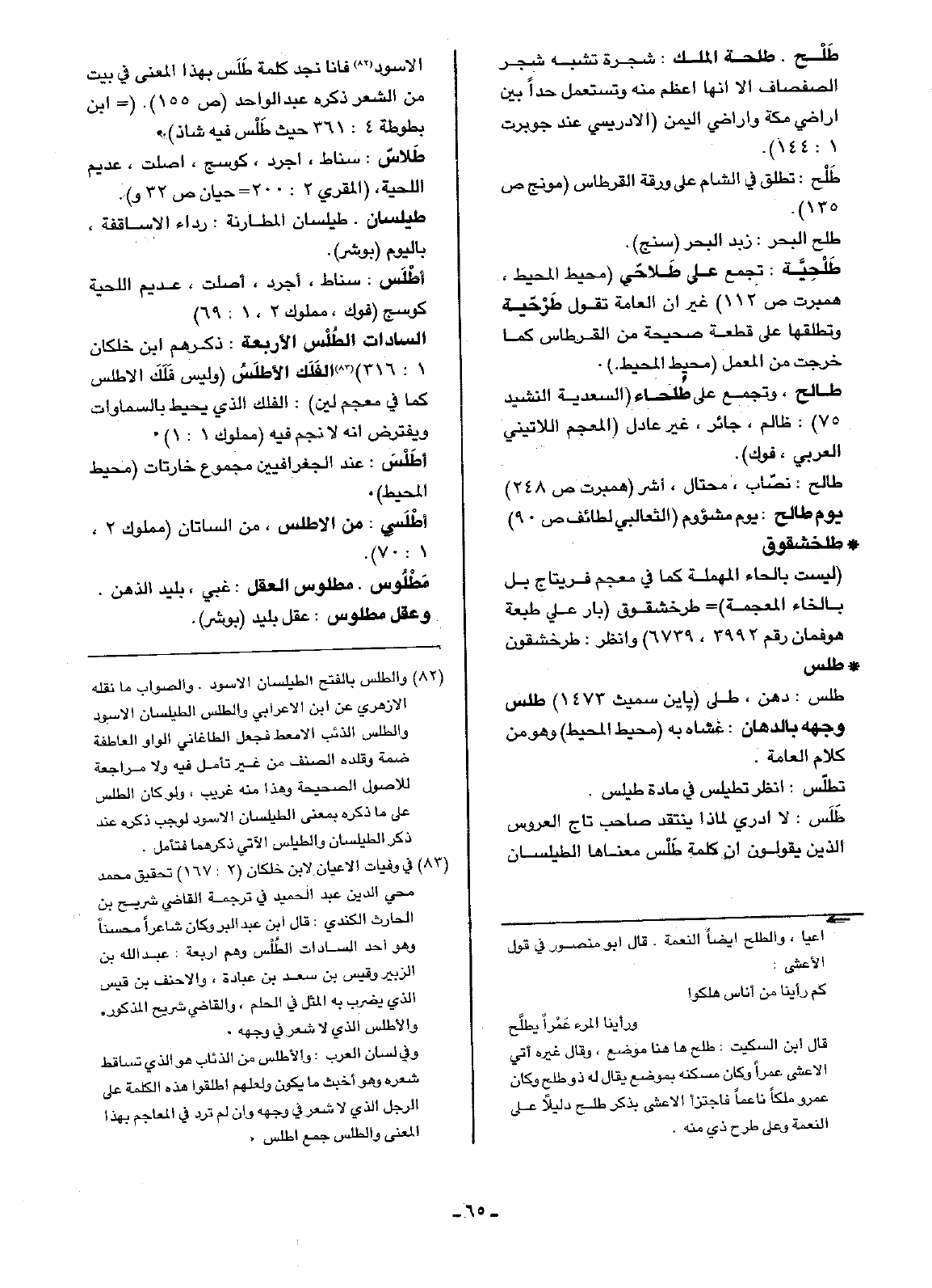 طَلَس: لا أدري لماذا ينتقد صاحب تاج العروس الذين يقولون أن كلمة طَلْس معناها الطيلسان الاسود فأنا نجد كلمة طَلَس بهذا المعنى في بيت من الشعر ذكره عبد الواحد (ص155) (= ابن بطوطة 4: 361 حيث طَلْس فيه شاذ) طَلاس: سناط، اجرد، كوسج، اصلت، عديم اللحية، (المقري 2: 200 = حيان ص32 و).
