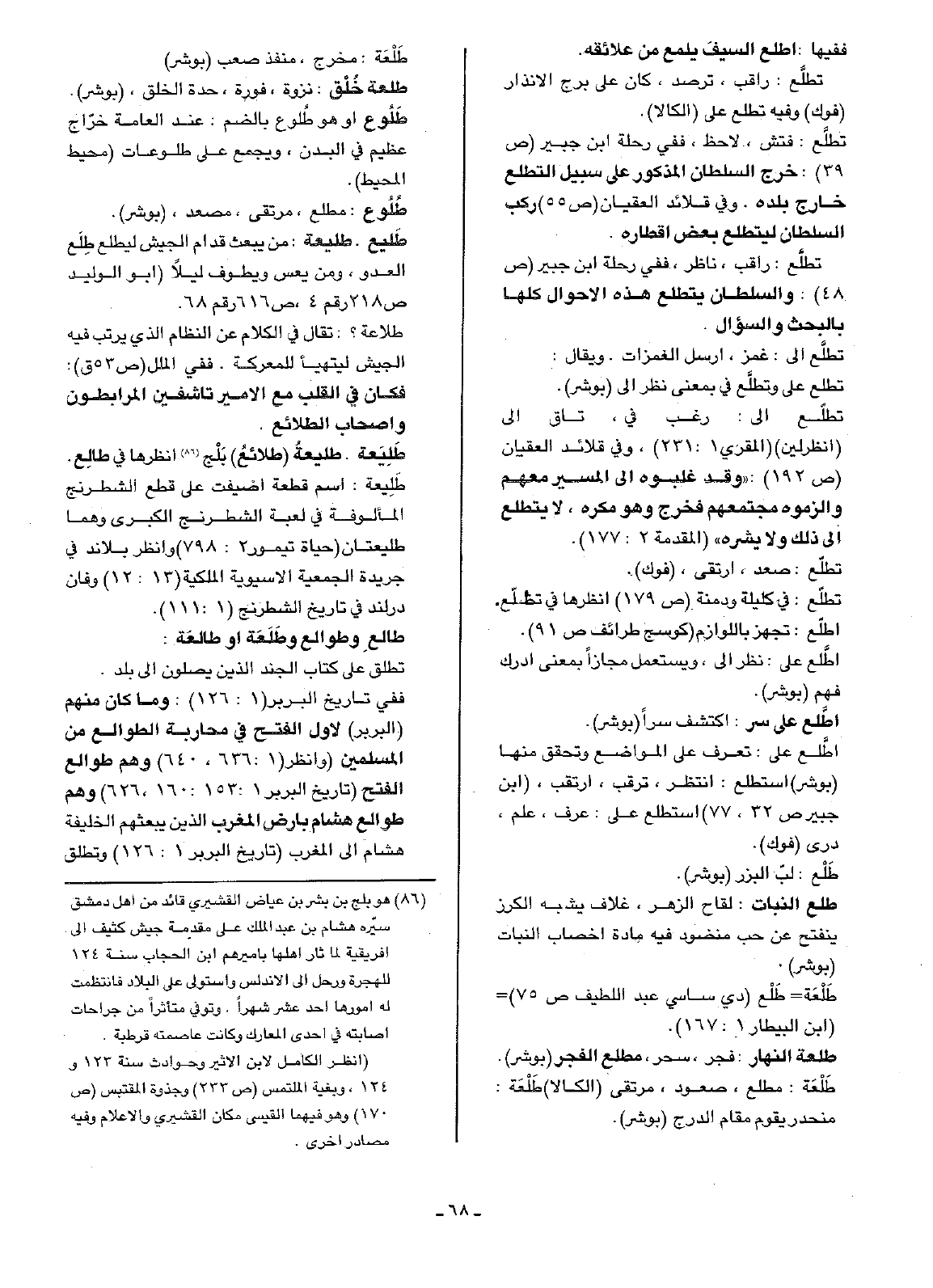 ففي تاريخ البربر (1: 126): وما كان منهم (البربر) لأول الفتح في محاربة الطوالع من المسلمين (وانظر (1: 636، 640) وهم طوالع الفتح (تاريخ البربر 1: 153: 160، 626) وهم طوالع هشام بأرض المغرب الذين يبعثهم الخليفة هشام إلى المغرب (تاريخ البربر 1: 126) وتطلق