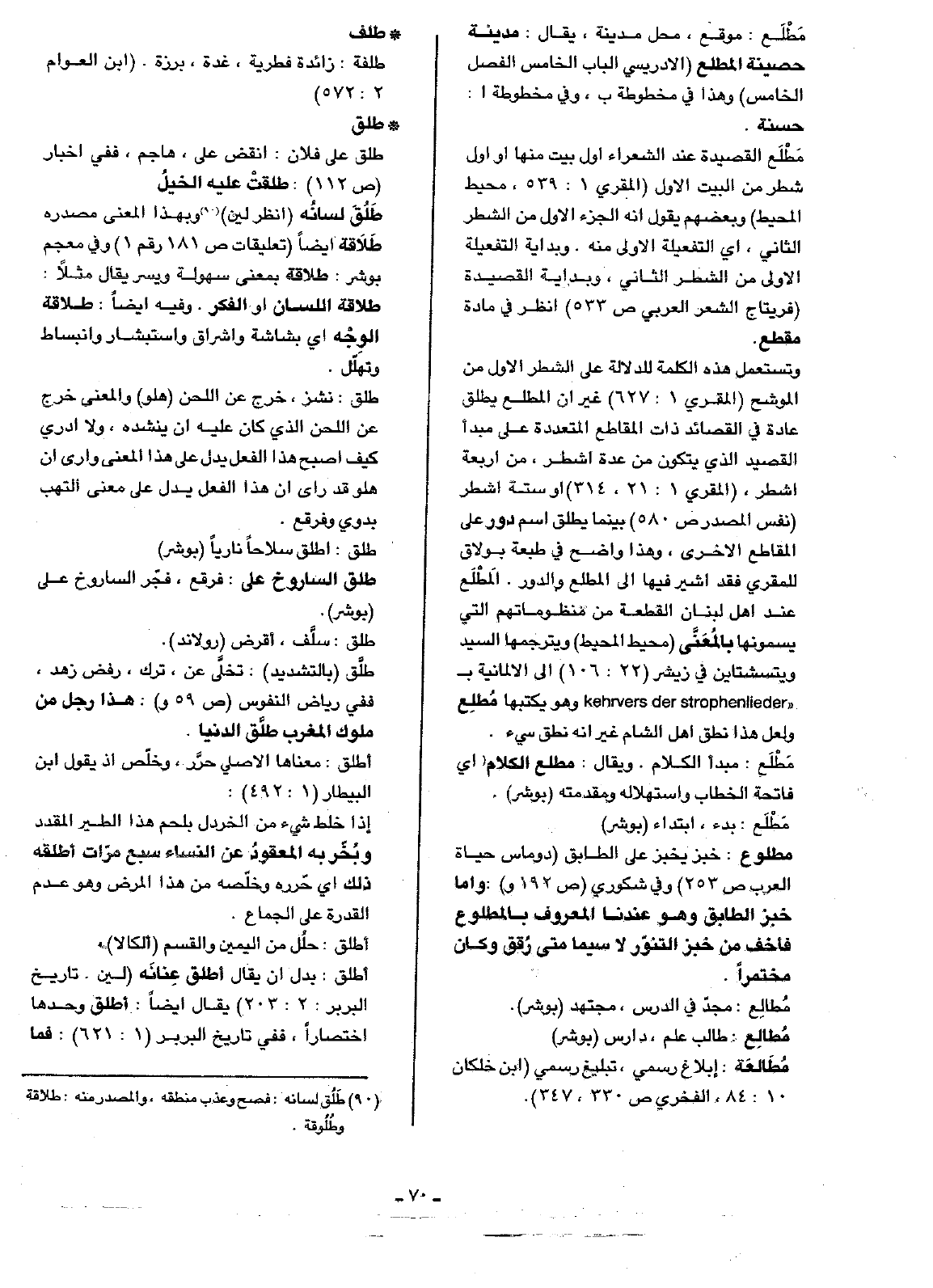 • طلق: طلق على فلان: انقض على، هاجم، ففي أخبار (ص112): طلْقت عليه الخيلُ طَلُقَ لسانُه (انظر لين) وبهذا المعنى مصدره طَلاَقة أيضا (تعليقات ص181 رقم 1) وفي معجم بوشر: طلاقة بمعنى سهولة ويسر يقال مثلاً: طلاقة اللسان أو الفكر. وفيه أيضاً: طلاقة الوِجْه أي بشاشة وإشراق واستبشار وانبساط وتهّلل.