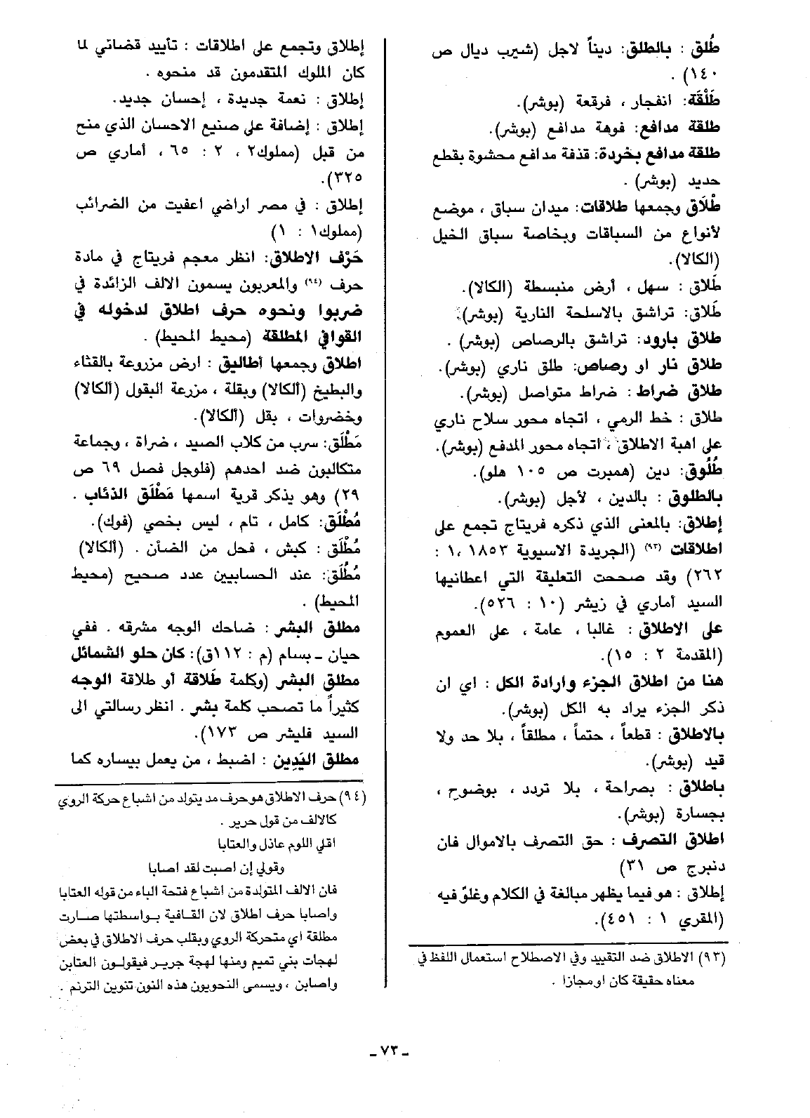 إطلاق: بالمعنى الذي ذكره فريتاج تجمع على اطلاقات (الجريدة الآسيوية 1853، 1: 262) وقد صححت التعليقة التي أعطانيها السيد أماري في زيشر (10: 526).