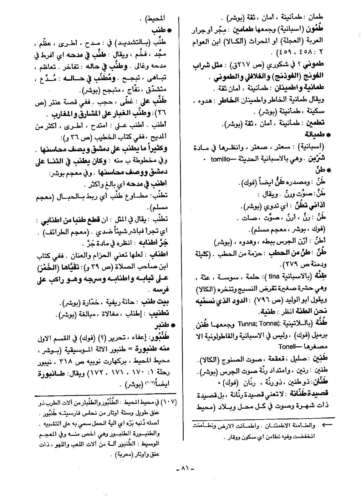 طُنَّة (باللاتينية:) Tonna ; Tunna وجمعها طُنن برميل (فوك)، وليس في الأسبانية والقاطولونية إلا مصغرها - Tonell طَنِين: صليل، قعقعة، صوت الصنوج (ألكالا).