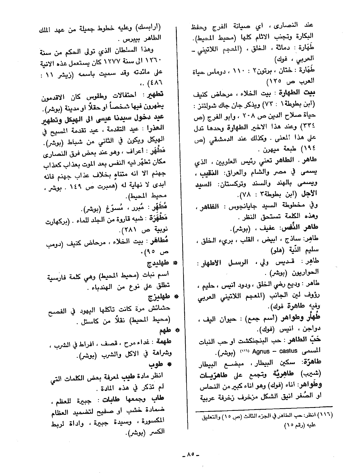 طَهَارة: دماثة، الخلق، (المعجم اللاتيني - العربي، فوك) طَهَارة: ختان، برتون 2:110، دوماس حياة العرب ص125) بيت الطهارة: بيت الخلاء، مرحاض كنيف (ابن بطوطة 1: 73) ويذكر جان جاك شولتنز: حياة صلاح الدين ص208، وأبو الفرج (ص334) وعند هذا الأخير الطهارة وحدها تدل على هذا المعنى. وكذلك عند الدمشفي (ص194) طبعة ميهرن.