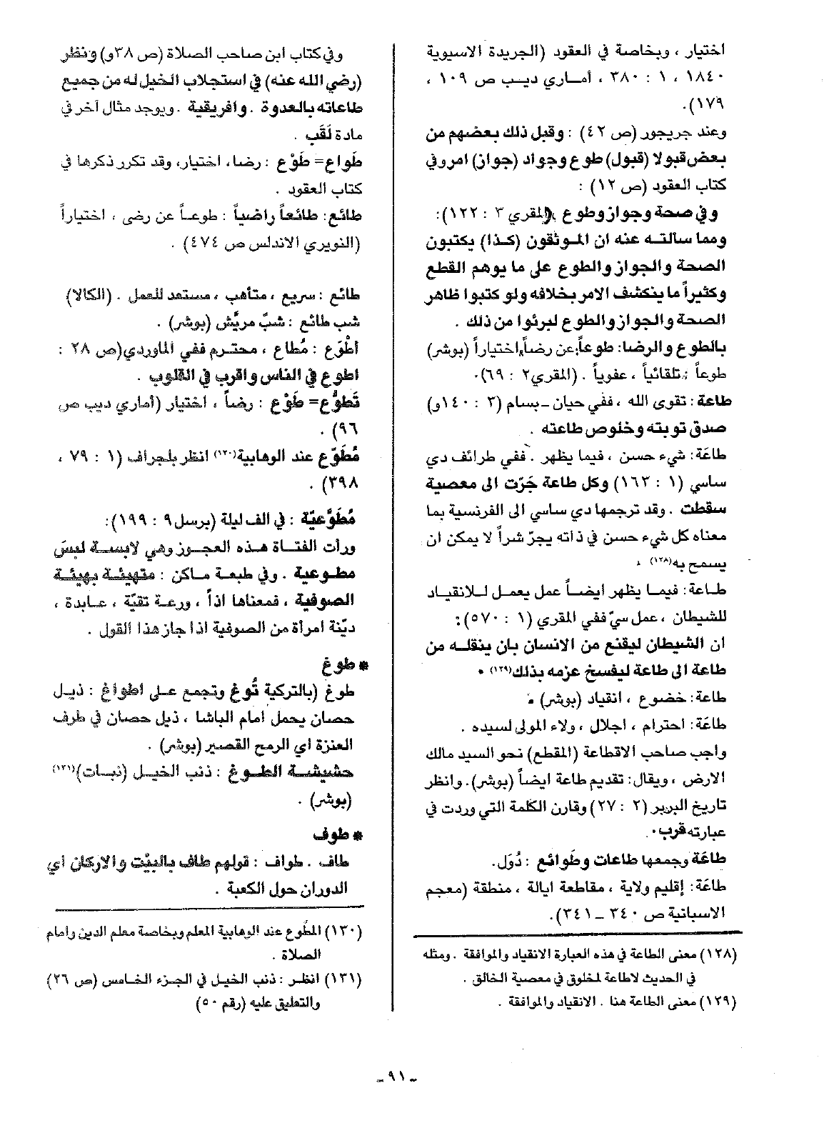 طاعَة: شيء حسن، فيما يظهر. ففي طرائف دي ساسي (1: 163) وطل طاعة جرت إلى معصية سقطت. وقد ترجمها دي ساسي إلى الفرنسية بما معناه كل شيء حسن في ذاته يجر شراً لا يمكن أن يسمح به.