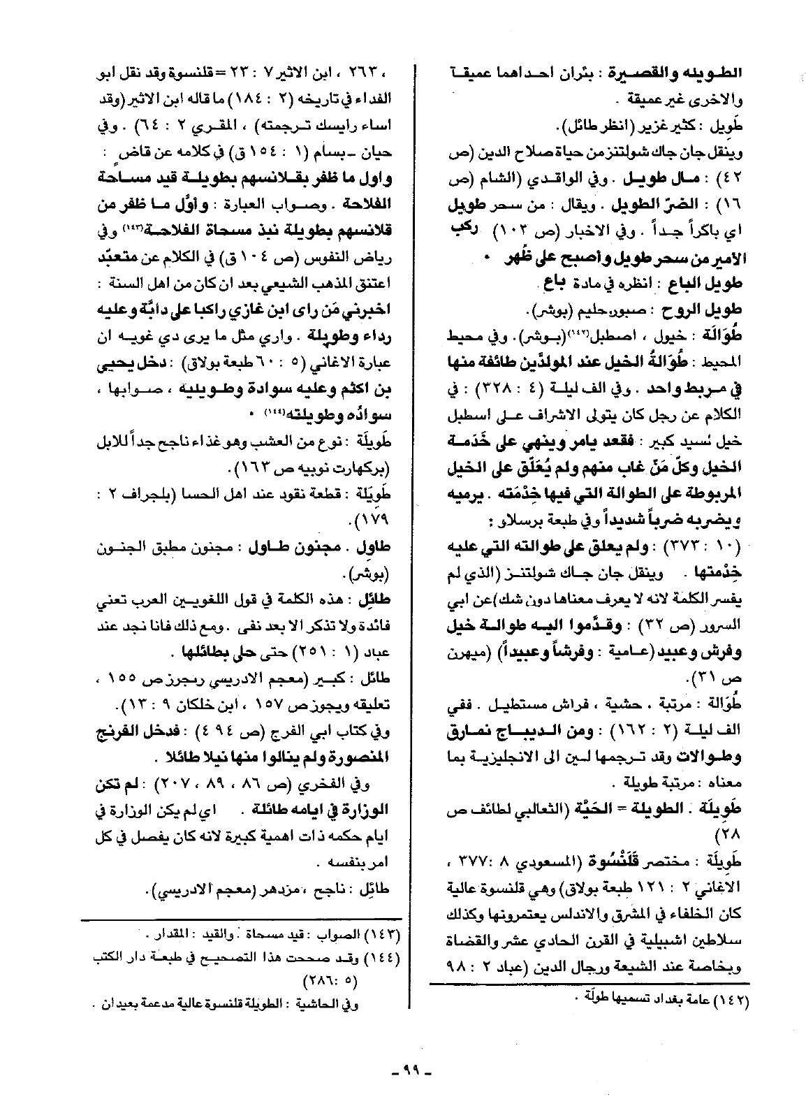 طَوِيلَة. الطويلة= الحَيَّة (الثعالبي لطائف ص28) طَوِيلَة: مختصر قَلَنْسُوة (المسعودي 8: 377، الأغاني 2: 121 طبعة بولاق) وهي قلنسوة عالية كان الخلفاء في المشرق والأندلس يعتمرونها وكذلك سلاطين اشبيلية في القرن الحادي عشر والقضاة وبخاصة عند الشيعة ورجال الدين (عباد 2: 98، 263، ابن الأثير 7: 23) قلنسوة وقد نقل أبو الفداء في تاريخه (2: 184) ما قاله ابن الأثير (وقد أساء رايسك ترجمته)، المقري 3:64). وفي حيان- بسام (1: 154ق) في كلامه عن قاض: وأول ما ظفر بقلانسهم بطويلة قيد مساحة الفلاحة. وصواب العبارة: وأول ما ظفر من قلانسهم بطويلة نبذ مسحاة الفلاحة وفي رياض النفوس (ص104 ق) في الكلام عن متعبد اعتنق المذهب الشيعي بعد أن كان من أهل السنة: أخبرني من رأى ابن غازي راكبا على دابَّة وعليه رداء وطويلة. واري مثل ما يرى دي غويه أن عبارة الأغاني (5: 60 طبعة بولاق): دخل يحيى بن أكثم وعليه سوادة وطويليه، صوابها، سواده وطويلته.