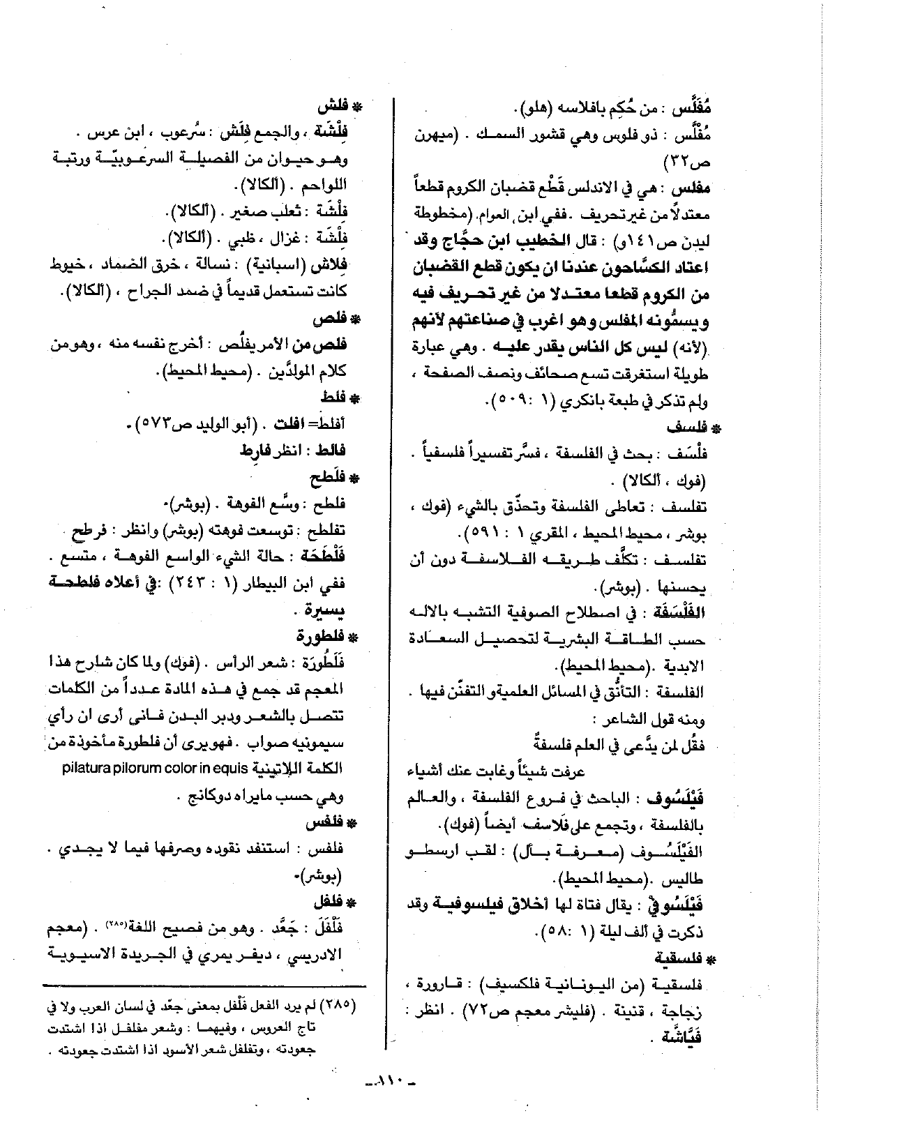• فلطورة: فلطورة: شعر الرأس. (فوك) ولما كان شارح هذا المعجم قد جمع في هذه المادة عددا من الكلمات تتصل بالشعر ودبر البدن فإني أرى إن رأي سيمونيه صواب. فهو يرى أن فلطورة مأخوذة من الكلمة اللاتينية pilatura pilorum color in equis وهي حسب ما يراه دوكانج.