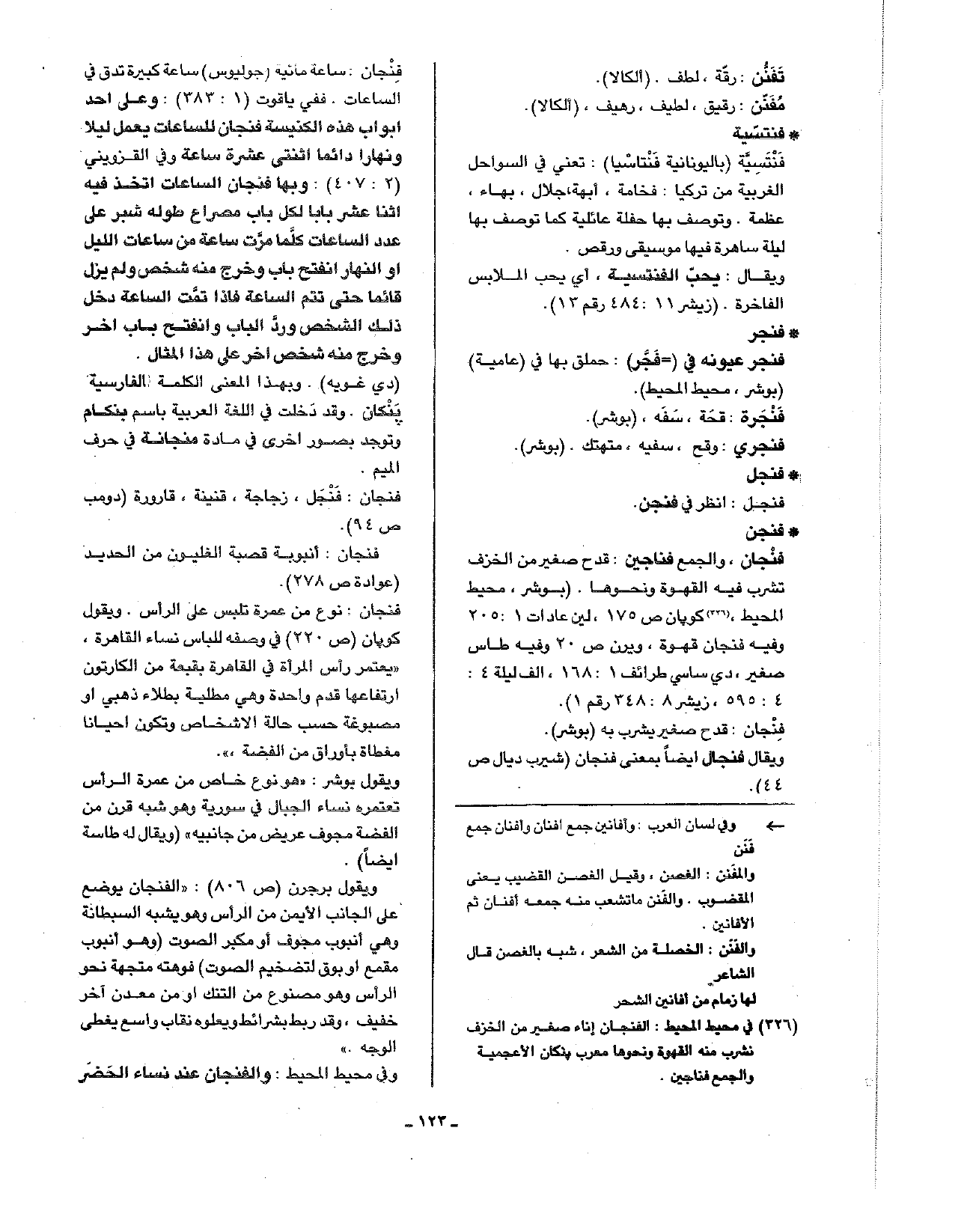 • فنجن: فنجان، والجمع فناجين: قدح صغير من الخزف تشرب فيه القهوة ونحوها. (بوشر، محيط المحيط، كوبان ص175، لين عادات 1: 205 وفيه فنجان قهوة، ويرن ص20 وفيه طاس صغير، دي ساسي طرائف 1: 168، ألف ليلة 4: 4: 595، زيشر 8: 348 رقم1).