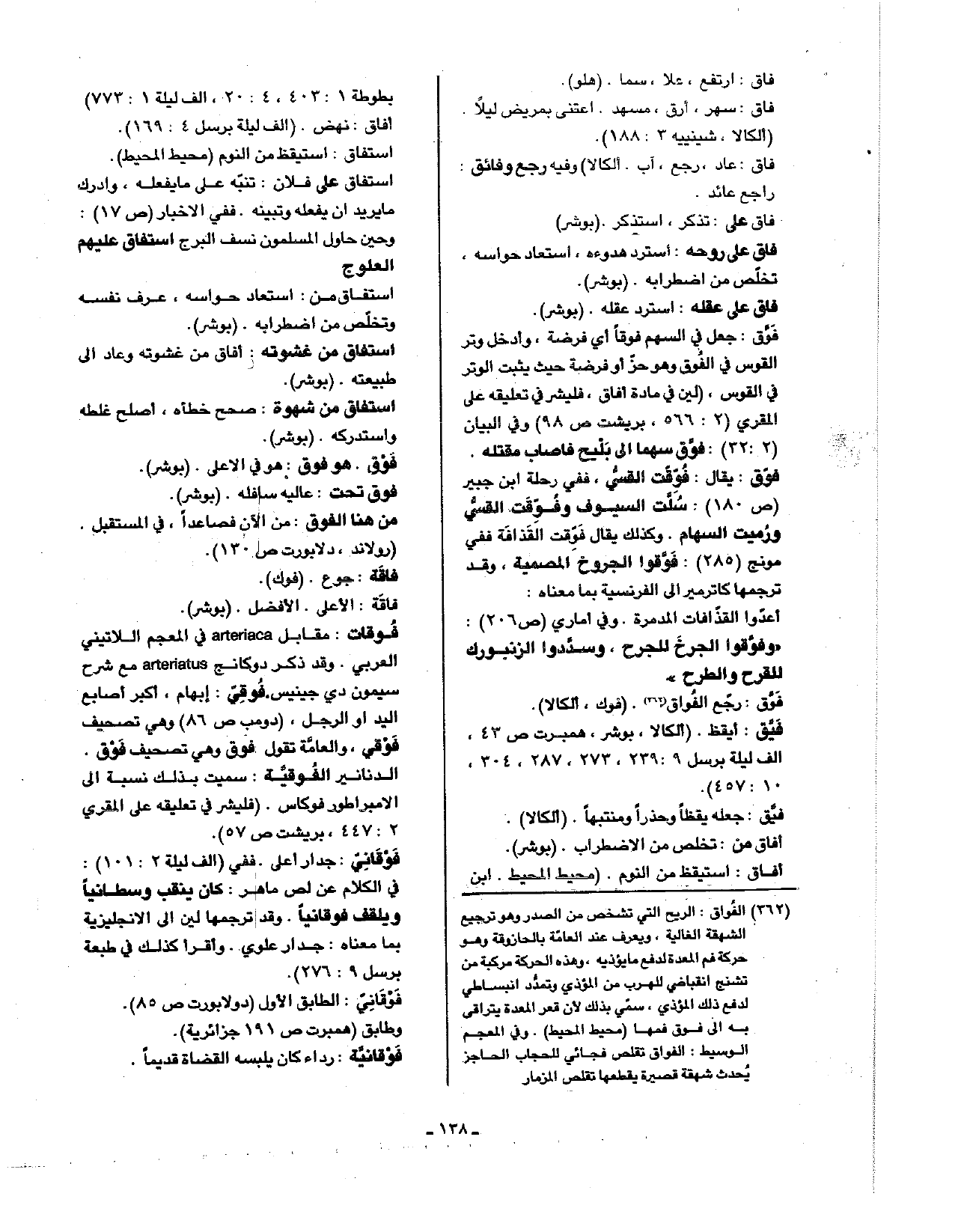 فوقات: مقابل arteriaca في المعجم اللاتيني العربي. وقد ذكر دوكانج arteriatus مع شرح سيمون دي جينيس. فوقي: إبهام، اكبر أصابع اليد أو الرجل، (دومب ص86) وهي تصحيف فوقي، والعامة تقول فوق وهي تصحيف فوق. الدنانير الفوقية: سميت بذلك نسبة إلى الإمبراطور فوكاس. (فليشر في تعليقه على المقري 2: 447، بريشت ص57).
