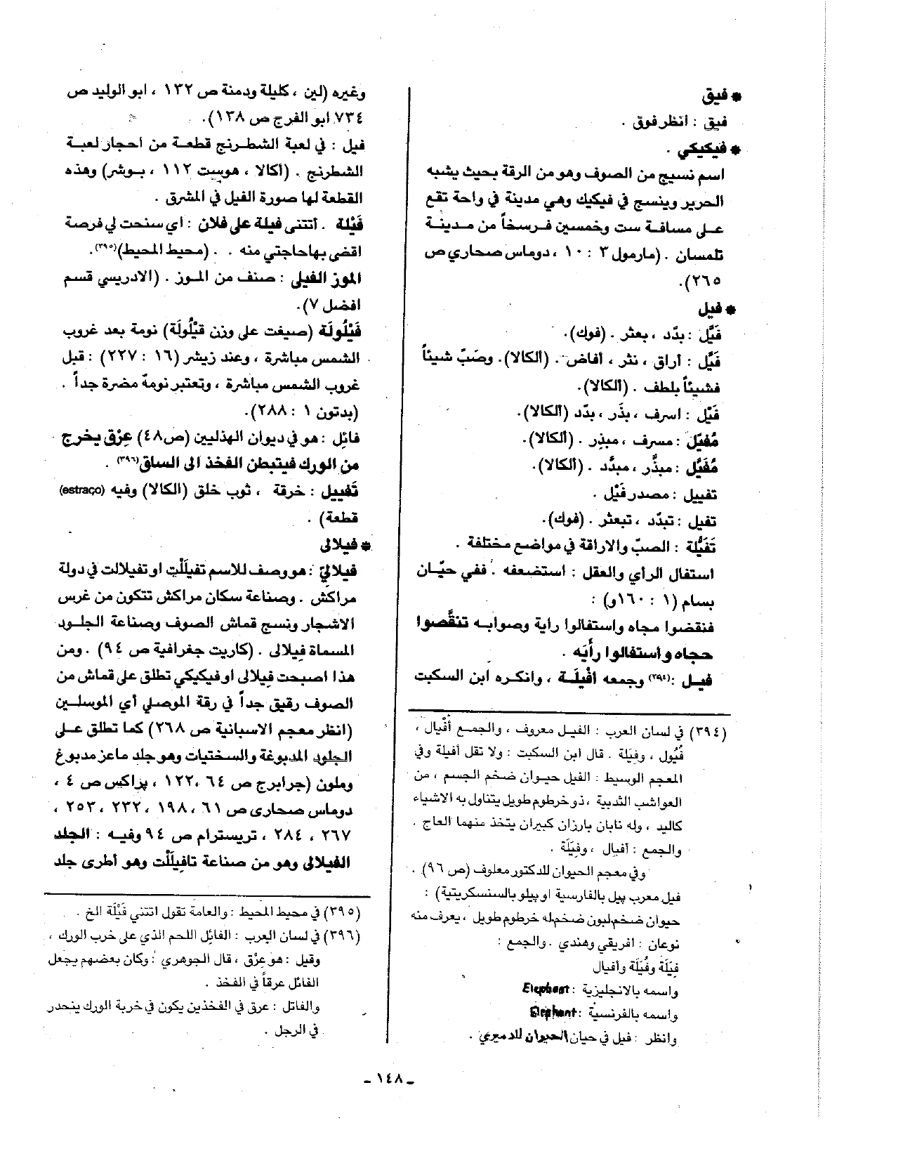 فيل: وجمعه أفيلة، وأنكره ابن السكبت وغيره (لين، كليلة ودمنة ص132، أبو الوليد ص734 أبو الفرج ص138).