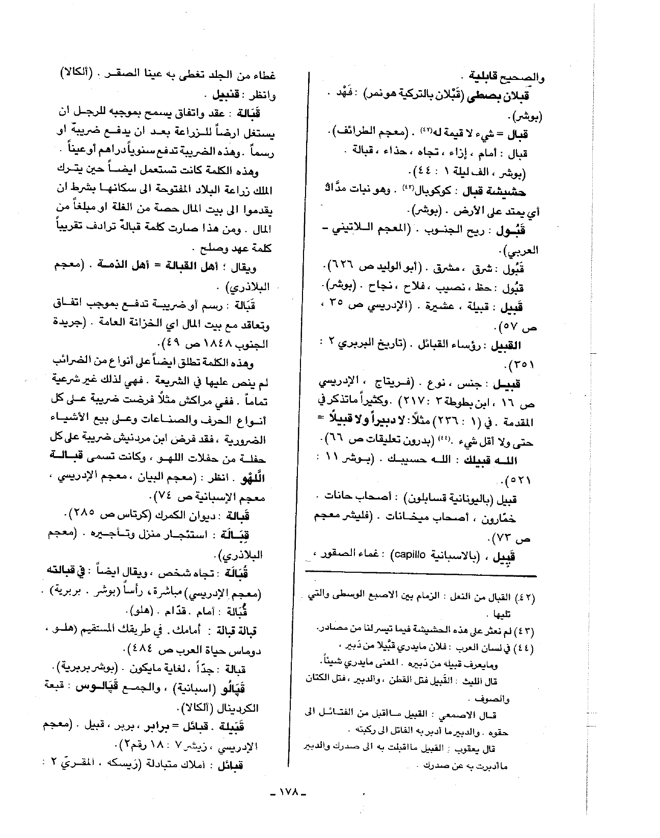 قبيل: جنس، نوع. فريتاج، الإدريسي ص16، ابن بطوطة 3: 217). وكثيرا ما تذكر في المقدمة. في (1: 236) مثلا: لا دبيرا ولا قبيلا= حتى ولا أقل شيء. (بدرون تعليقات ص66).