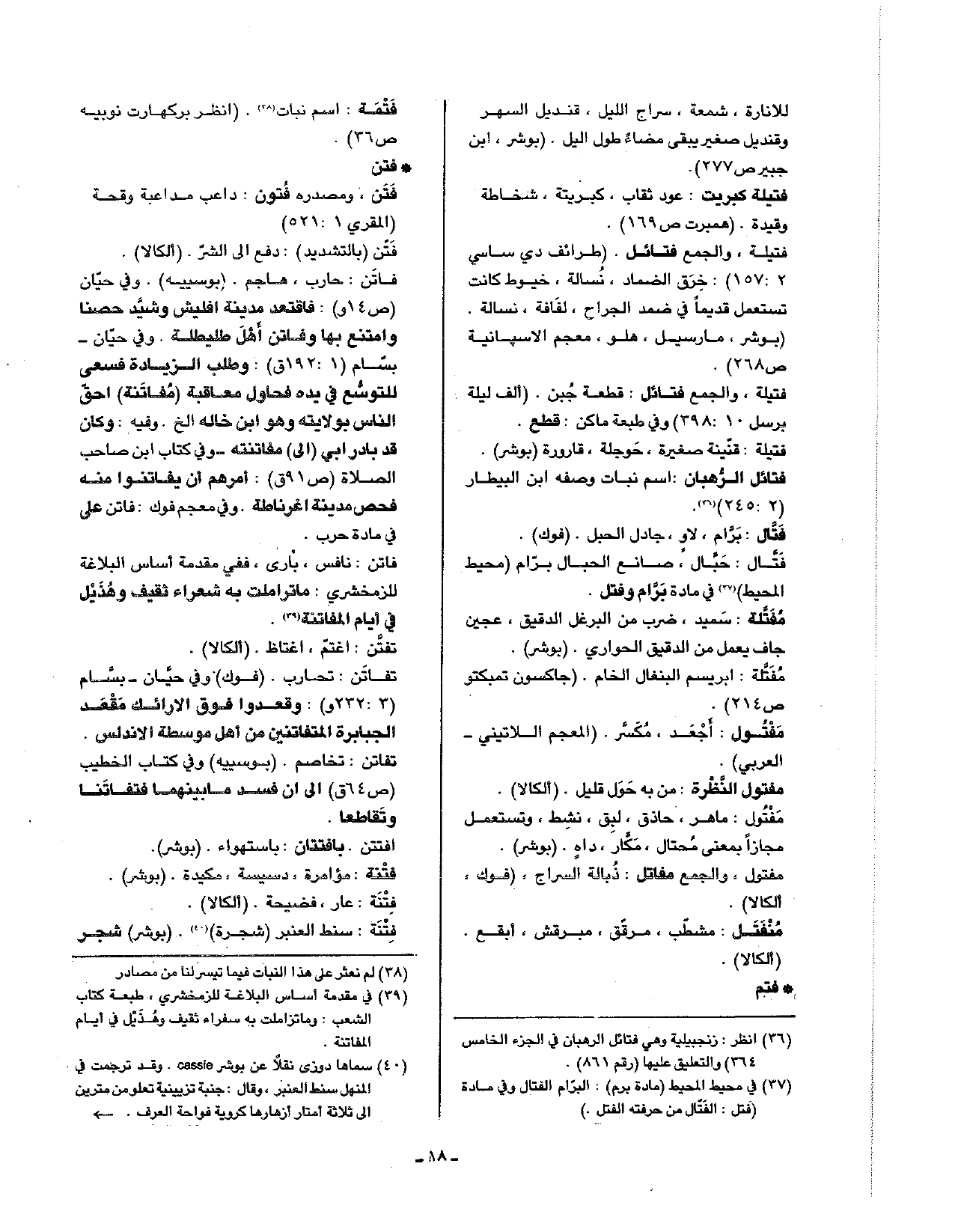 فاتن: حارب، هاجم. (بوسييه). وفي حيان (ص14 و): فاقتعد مدينة أفليش وشيد حصنا وأمتنع بها فاتن أهل طليطلة. وفي حيان - بسام (192:1 ق): وطلب الزيادة فسعى للتوسع في يده فحاول معاقبة (مفاتنة) أحق الناس بولايته وهو ابن خاله الخ. وفيه: وكان قد بادر أبي (إلى) مفاتنته - وفي كتاب ابن صاحب الصلاة (ص91 ق): أمرهم أن يفتتنوا منه فحص مدينة غرناطة. وفي معجم فوك: فاتن على في مادة حرب.