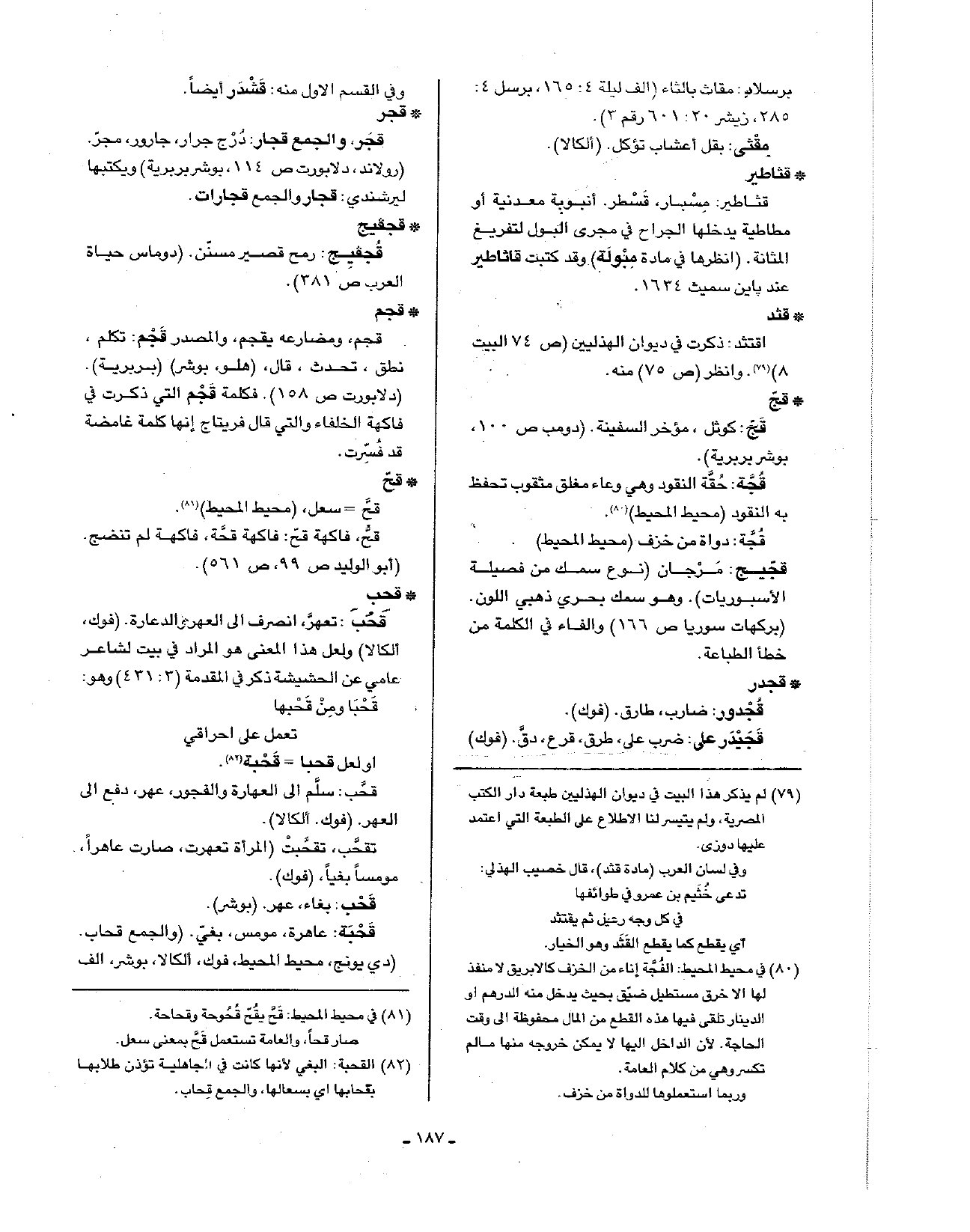 • قجم: قجم، ومضارعه يقجم، والمصدر قجم: تكلم، نطق، تحدث، قال، (هلو، بوشر) (بربرية). (دلابورت ص158). فكلمة قجم التي ذكرت في فاكهة الخلفاء والتي قال فريتاج إنها كلمة غامضة قد فسرت.