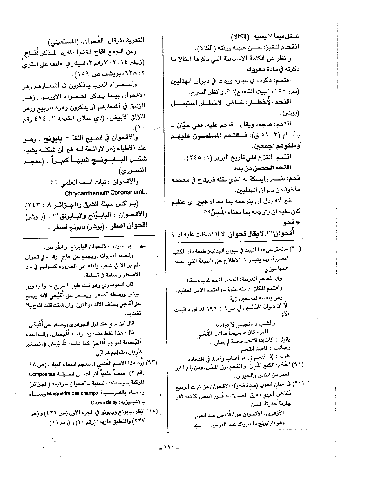 • قحو: أقحوان: لا يقال قحوان إلا إذا دخلت عليه أداة التعريف فيقال: القحوان. (المستعيني).