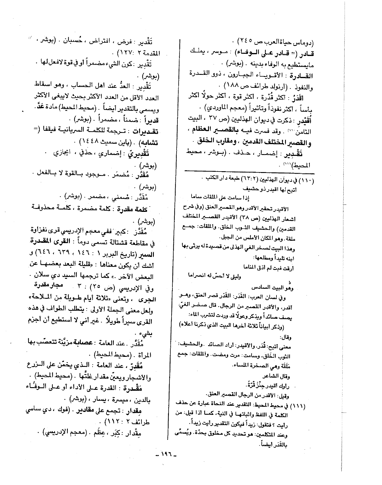مقدر: كبير ففي الإدريسي قرى نفرازة في مقاطعة قشتالة تسمى دوما: القرى المقدرة السير (تاريخ البربر 1: 146، 639، 646) واشك أن يكون معناها: (قليلة البعد بعضها عن البعض الآخر). كما ترجمها السيد دي سلان. وفي الإدريسي (ص25): 3 مجار مقدرة الجري، وتعنى ثلاثة أيام طويلة من الملاحة) ولعل معنى الجملة الأولى: يتطلب الطواف في هذه القرى سيرا طويلا. غير إني لا أستطيع أن اجزم بشيء.