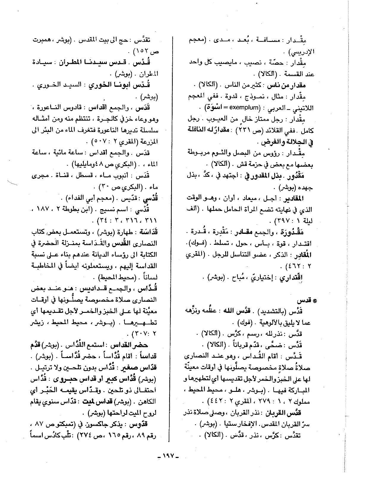 قدس: أقام القداس، وهو عند النصارى صلاة مخصوصة يصلونها في أوقات معينة لها على الخبز والخمر لأجل تقديسها أي لتطهيرها والمباركة فيها. (بوشر، هلو، محيط المحيط، مملوك 2، 1: 279، المقري 2: 442).