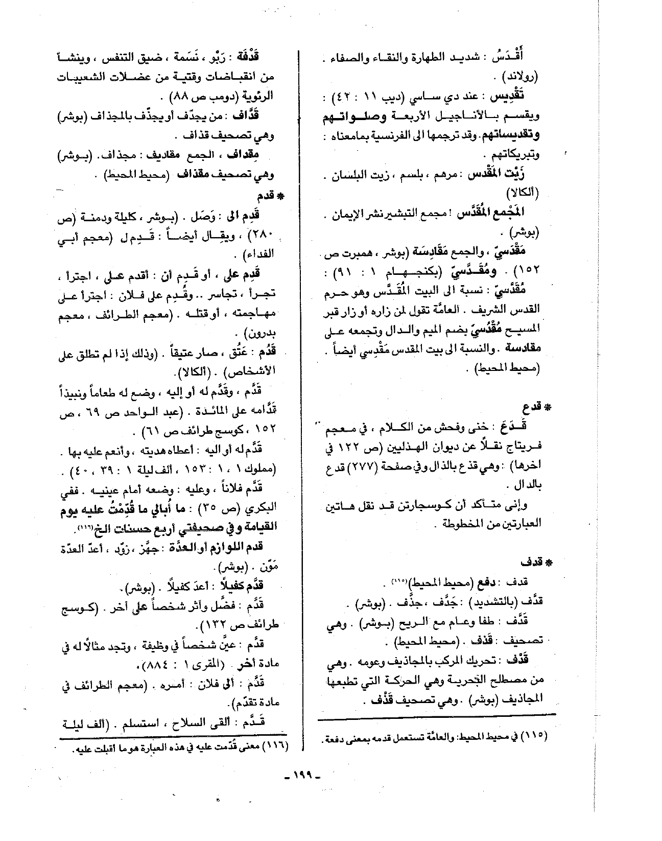 • قدم: إلى: وصل. (بوشر، كليلة ودمنة (ص280)، ويقال أيضا: قدم ل (معجم أبي الفداء).