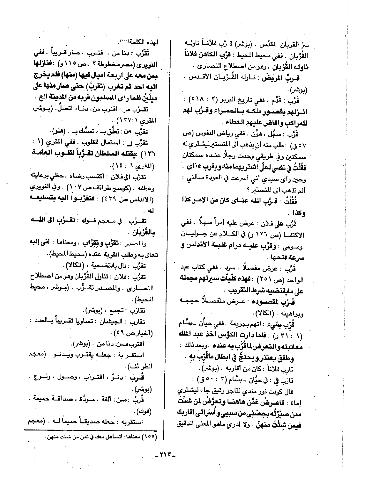 قرب: سهل، هون. ففي رياض النفوس (ص 57ق): طلب منه أن يذهب إلى المنستير ليشتري له سمكتين وفي طريقي وجدت رجلا عنده سمكتان فقلت في نفسي لعلي أشتريهما منه ويقرب عناي. وحين رأى سيدي إني أسرعت في العودة سألني: ألم تذهب إلى المنستير؟ فقلت: قرب الله عناي كان من الأمر كذا وكذا.