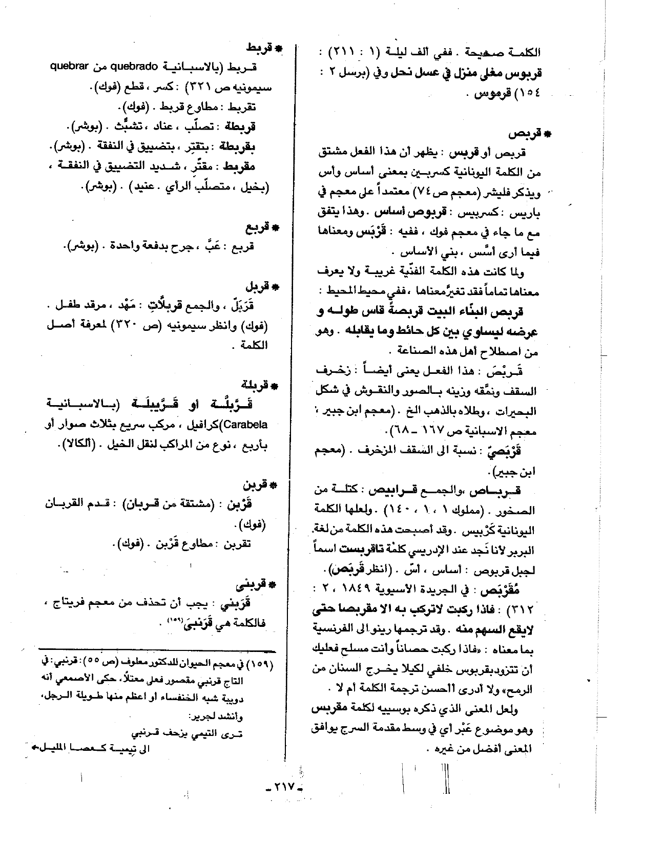 مقربص: في الجريدة الآسيوية 1849، 2: 312): فإذا ركبت لا تركب به إلا مقربصا حتى لا يقع السهم منه. وقد ترجمها رينو إلى الفرنسية بما معناه: (فإذا ركبت حصانا وأنت مسلح فعليك أن تتزود بقربوس خلفي لكيلا يخرج السنان من الرمح) ولا أدري أأحسن ترجمة الكلمة أم لا.