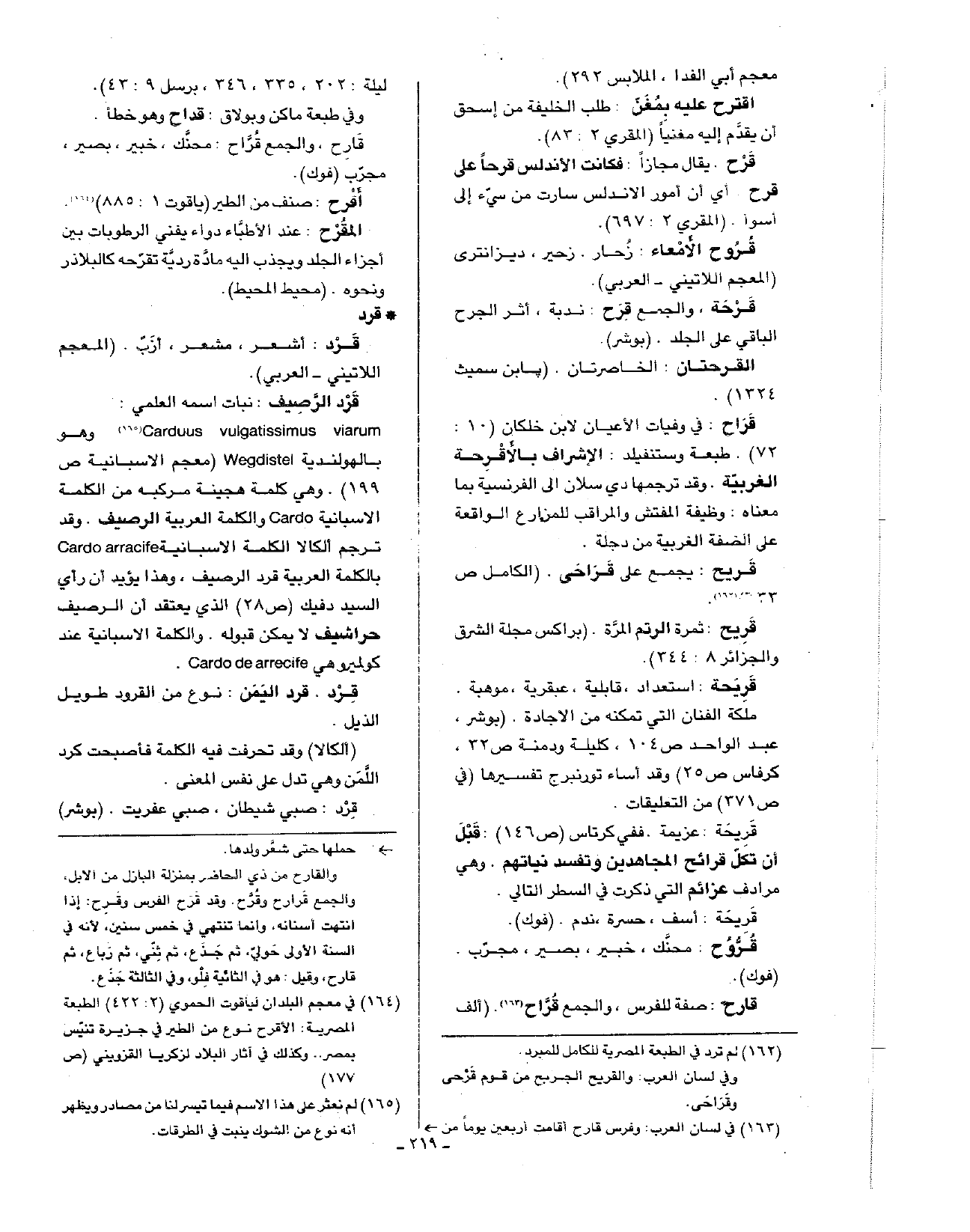 قرد الرصيف: نبات اسمه العلمي: Carduus vulgatissimus viarum وهو بالهولندية Wegdistel ( معجم الأسبانية ص 199). وهي كلمة هجينة مركبة من الكلمة الأسبانية Cardo والكلمة العربية الرصيف. وقد ترجم الكالا الكلمة الأسبانية Cardo arraciee بالكلمة العربية قرد الرصيف، وهذا يؤيد أن رأي السيد دفيك (ص28) الذي يعتقد أن الرصيف حراشيف لا يمكن قبوله. والكلمة الأسبانية عند كولميرو هي Cardo de arrecife.