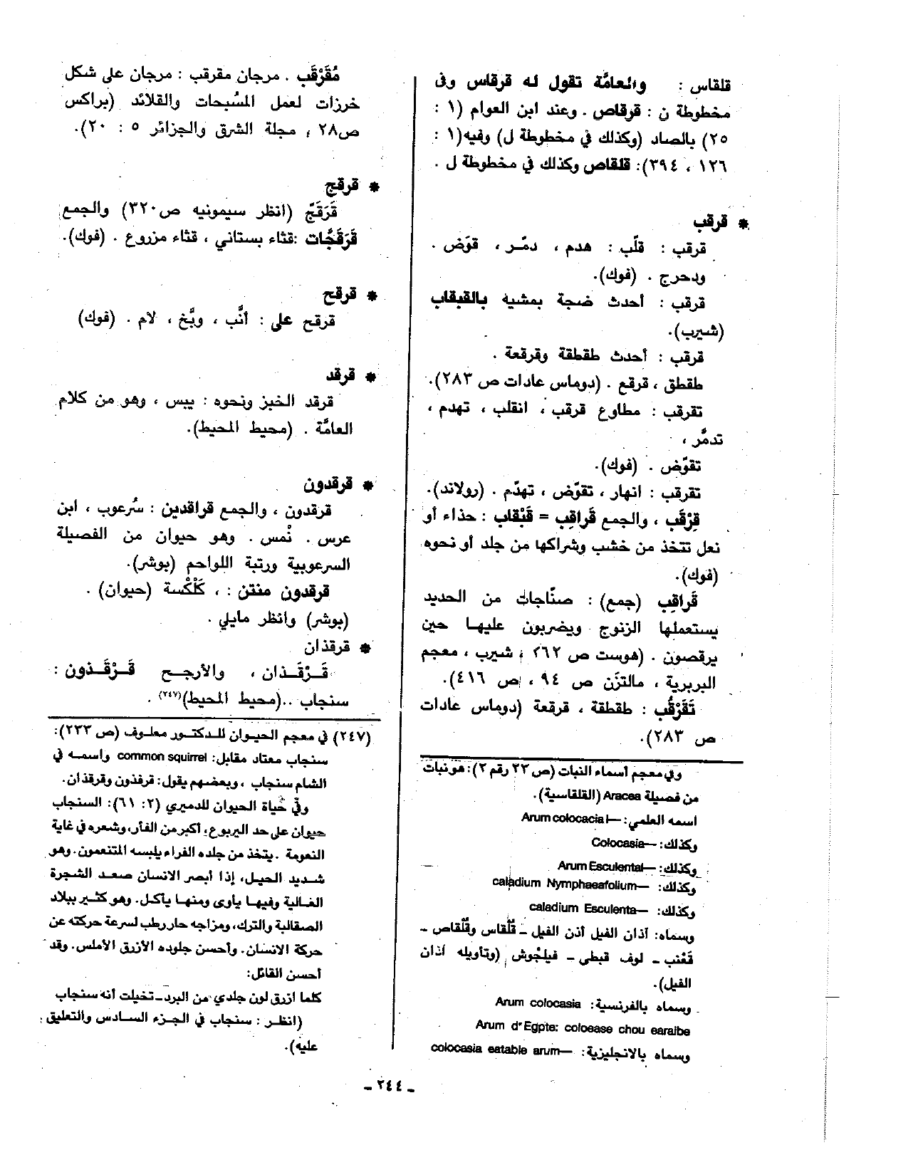 قلقاس: والعامة تقول له قرقاس وفي مخطوطة ن: قرقاص. وعند ابن العوام (1: 25) بالصاد (وكذلك في مخطوطة ل) وفيه (1: 126، 394): قلقاص وكذلك في مخطوطة ل.