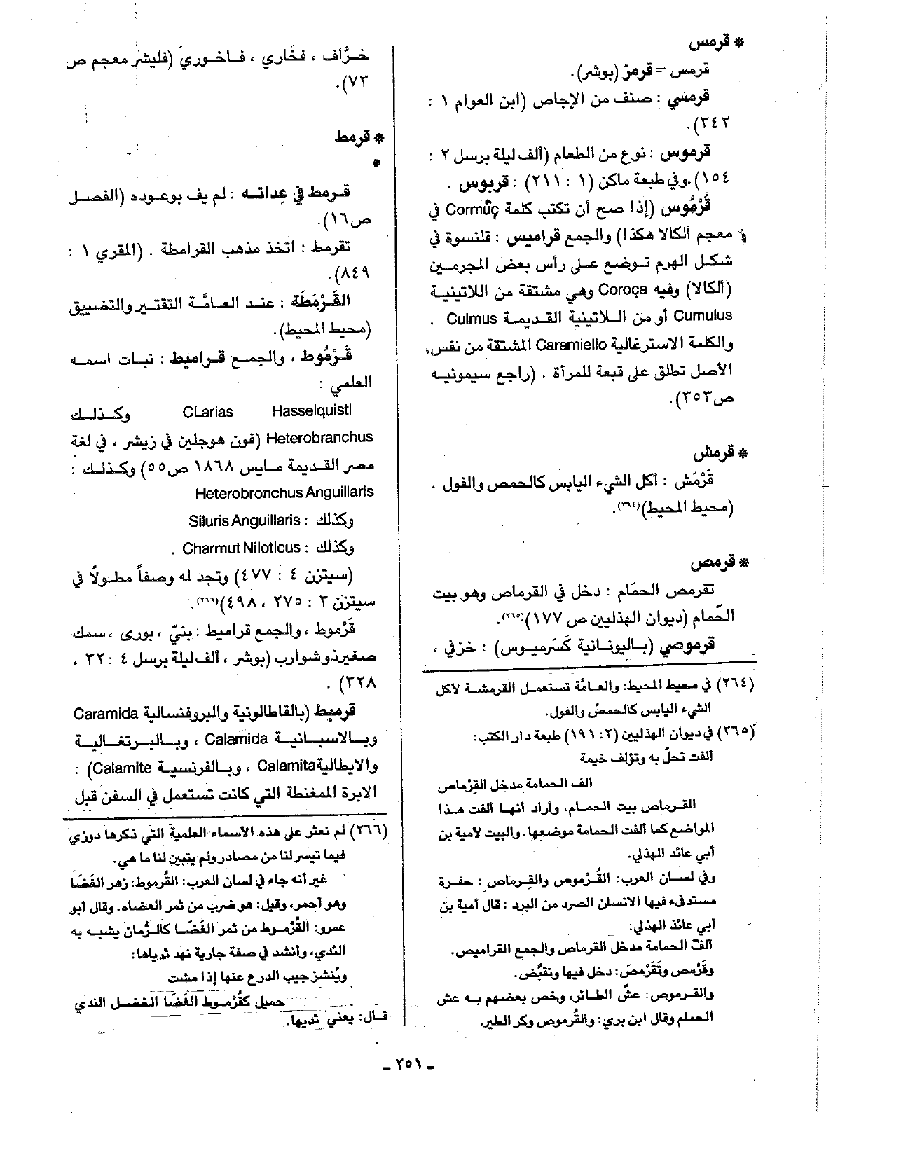 قرموس: نوع من الطعام (ألف ليلة برسل 2: 154). وفي طبعة ماكن (1: 211): قربوس.
