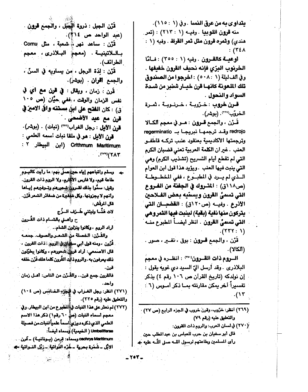 منه قرون اللوبيا. وفيه (1: 213): تمر هندي) وثمره قرون مثل ثمر القرظ. وفيه (1: 348): أوعية كالقرون. وفيه (1: 355): فأما الخرنوب البري فإنه نحيف القرون خفيفها. وفي ألف ليلة (1: 508): أخرجوا من الصندوق تلك الملعونة كأنها قرن خيار شنبر من شدة السواد والنحول.