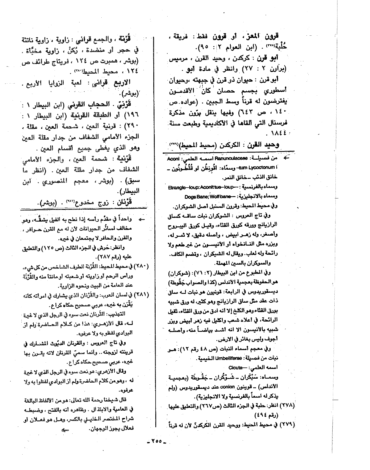 أبو قرن: حيوان ذو قرن في جبهته، وحيوان أسطوري بجسم حصان كان الأقدمون يفترضون له قرنا وسط الجبين. (عواده ص140، ص643) وفيها ينقل برون مذكرة فرسنال التي ألقاها في الأكاديمية وطبعت سنة 1844.