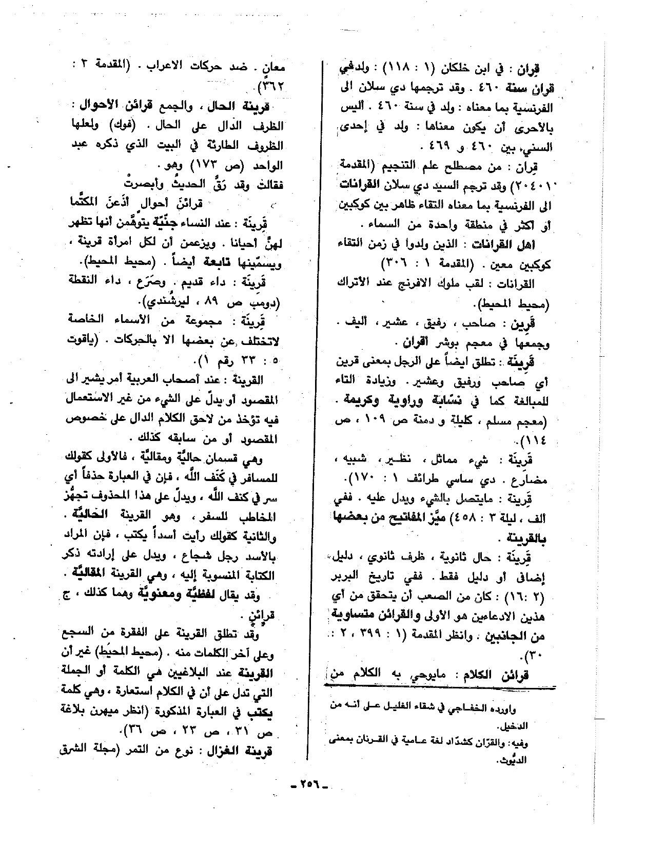 قرينة: حال ثانوية، ظرف ثانوي، دليل، إضافي أو دليل فقط. ففي تاريخ البربر (2: 16): كان من الصعب أن يتحقق من أي هذين الادعاءين هو الأولى والقرائن متساوية من الجانبين: وانظر المقدمة (1: 399، 2: 30).