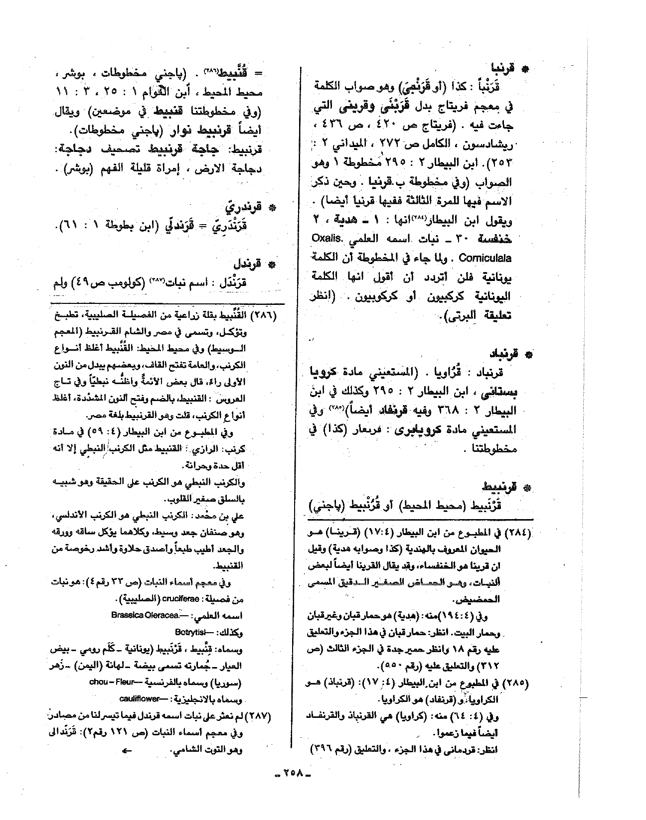 • قرنبا: قرنبا: كذا (أو قرنبي) وهو صواب الكلمة في معجم فريتاج بدل قربني وقريني التي جاءت فيه. (فريتاج ص420، ص436، ريشاردسون، الكامل ص272، الميداني 2: 253). ابن البيطار 2: 295 مخطوطة 1 وهو الصواب (وفي مخطوطة ب قرنيا. وحين ذكر الاسم فيها للمرة الثالثة ففيها قرنيا أيضا). ويقول ابن البيطار أنها: 1 - هدية، 2 - خنفسة 3 - نبات اسمه العلمي Oxalis Corniculal ولما جاء في المخطوطة أن الكلمة يونانية فلن أتردد أن أقول أنها الكلمة اليونانية كركبيون أو كركوبيون. (انظر تعليقة البرتى).