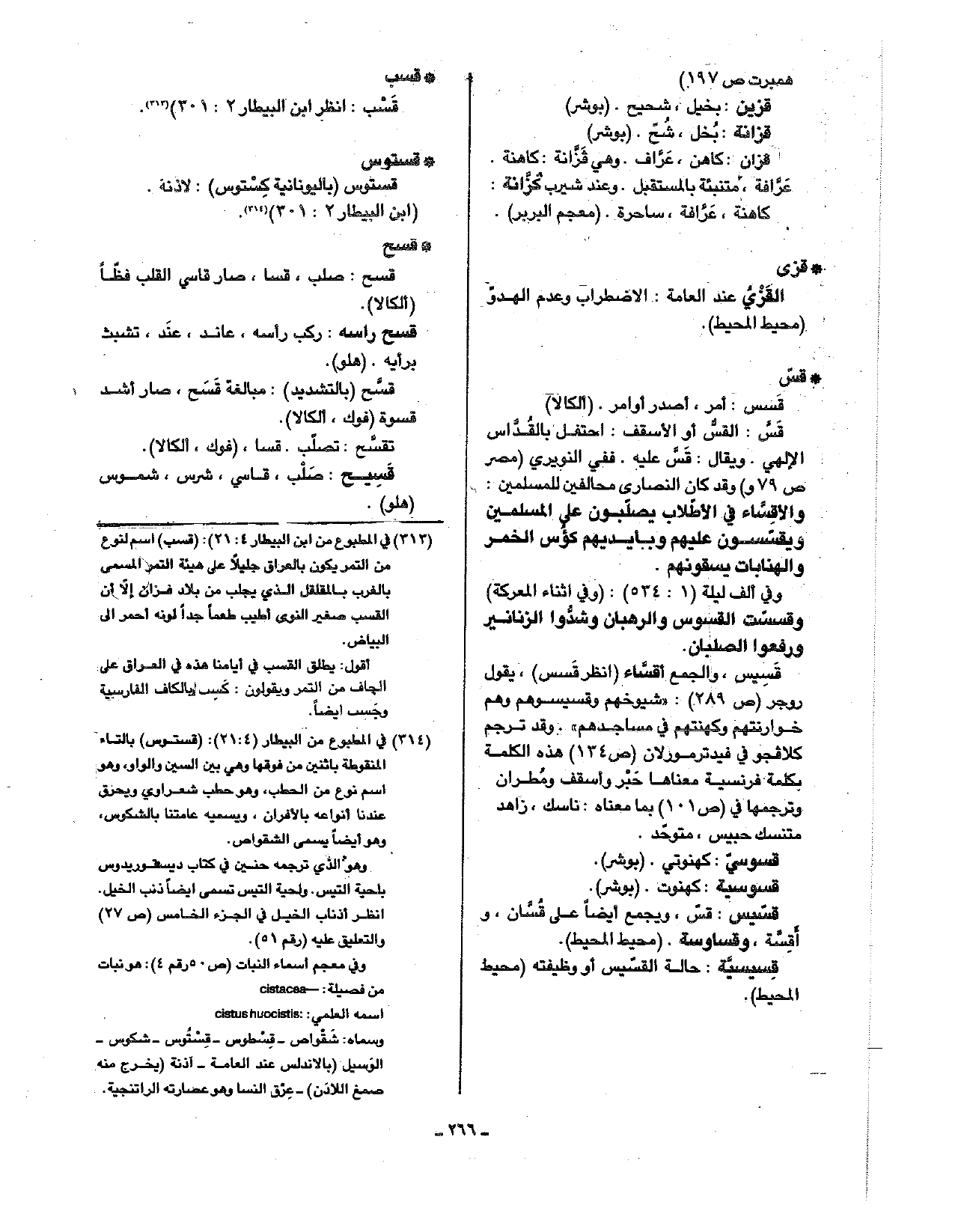 قس: القس أو الأسقف: احتفل بالقداس الإلهي. ويقال: قس عليه. ففي النويري (مصر ص79 و) وقد كان النصارى محالفين للمسلمين: والاقساء في الاطلاب يصلبون على المسلمين ويقسسون عليهم وبأيديهم كؤوس الخمر والهنابات يسقونهم.