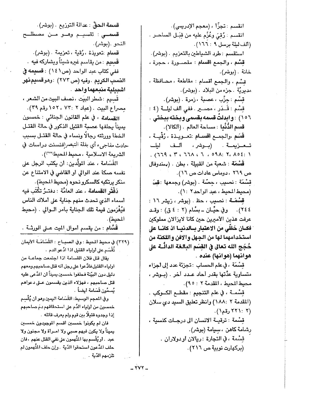 القسامة، في علم القانون الجنائي: خمسون يمينا يحلفها عصبة القتيل الذكور في حالة القتل الخطأ وورثته رجالا ونساء في حالة القتل بسبب حادث مفاجئ أي بقلة التبصر (فنسنت دراسات في الشريعة الإسلامية، محيط المحيط.